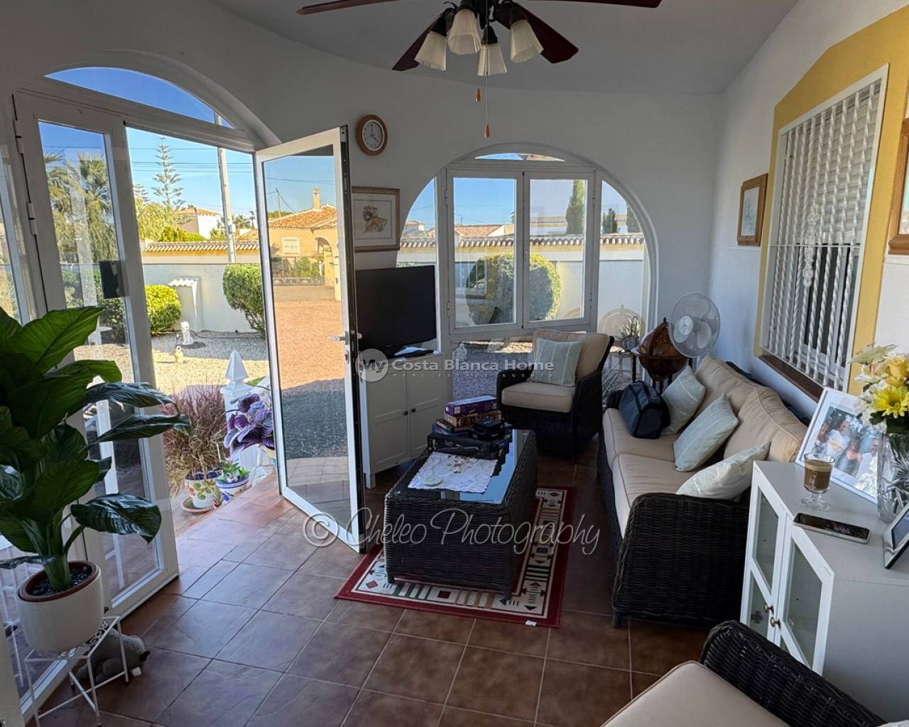 This well-presented detached villa offers 126 m² of comfortable living space on a fully walled and gated plot of 1,360 m². The property comprises a spacious air-conditioned lounge with feature fireplace and log burner, a modern fully fitted kitchen with independent garden access, and three generously sized bedrooms, all equipped with air conditioning and fitted wardrobes. The master bedroom benefits from an en-suite bathroom, complemented by a separate family bathroom. A glazed entrance porch provides an additional sitting area. There is also oil fired central heating throughout.