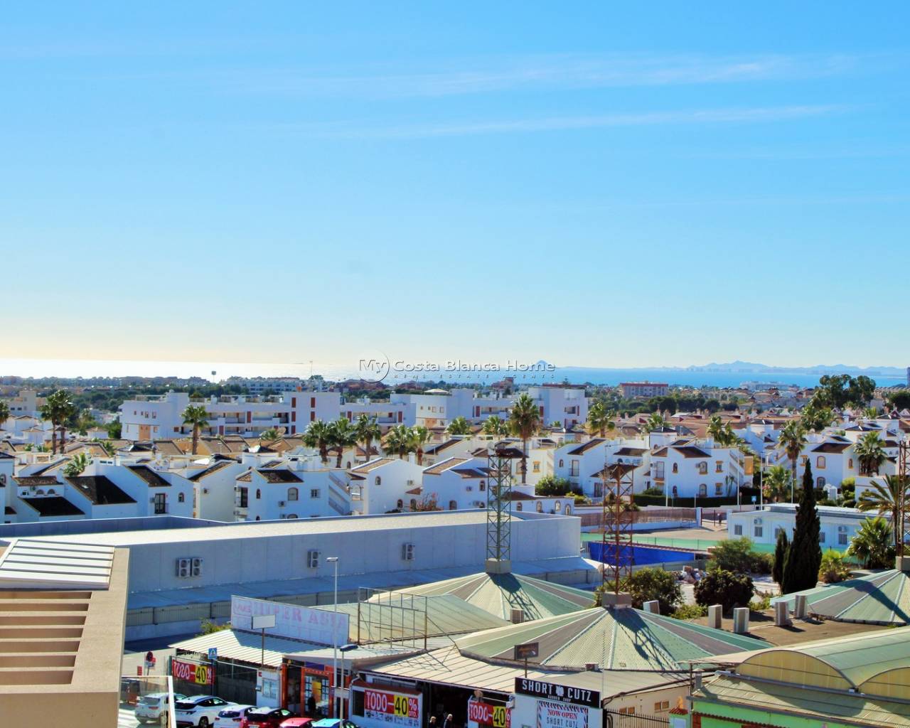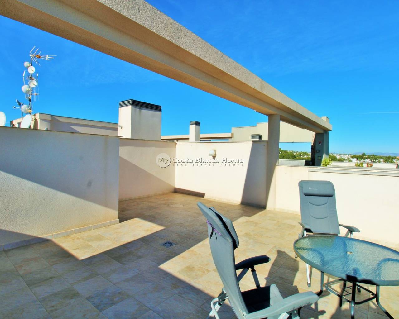 This stunning East-facing penthouse apartment is located in the highly sought-after Altos del Mediterráneo complex in Los Dolses, offering exceptional views of the Mediterranean Sea and the Mar Menor. Situated in Block 3 with convenient lift access, the property stands out for its modern design, fantastic outdoor spaces, and unbeatable proximity to local amenities. The interior comprises a bright and spacious lounge-dining area with an open-plan modern kitchen, two double bedrooms with fitted wardrobes, and two contemporary bathrooms, including an en-suite for the master bedroom. Both the lounge and master bedroom offer direct access to a sunny East-facing balcony fitted with glass curtains, perfect for enjoying the views all year round. From the balcony, an external staircase leads to the impressive private roof solarium, boasting panoramic views towards the sea, Mar Menor, La Manga, and the surrounding coastline. The solarium also features a storage room, ideal for outdoor furniture, beach gear, or personal belongings. The property includes a dedicated parking space inside the gated community, along with beautifully maintained communal areas and access to premium facilities — outdoor swimming pool, indoor heated pool, gym, sauna, and green areas. Located just a stone’s throw from a supermarket, shops, bars, restaurants, and a bus stop, the property is also within walking distance of Zenia Boulevard, Villamartin Plaza, and Villamartin Golf. An outstanding option for permanent living, holidays, or rental investment in one of the Orihuela Costa’s most desirable modern developments.