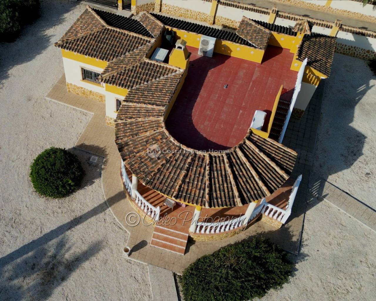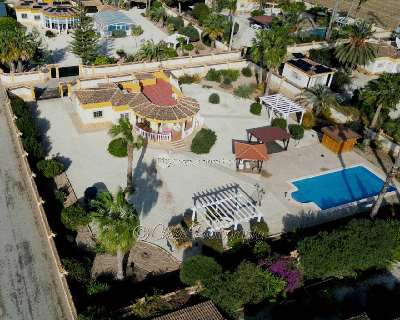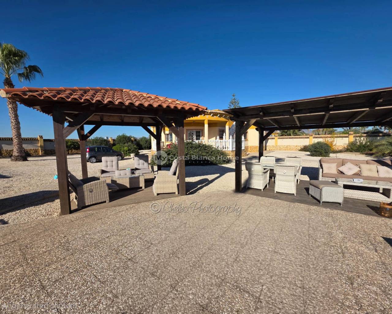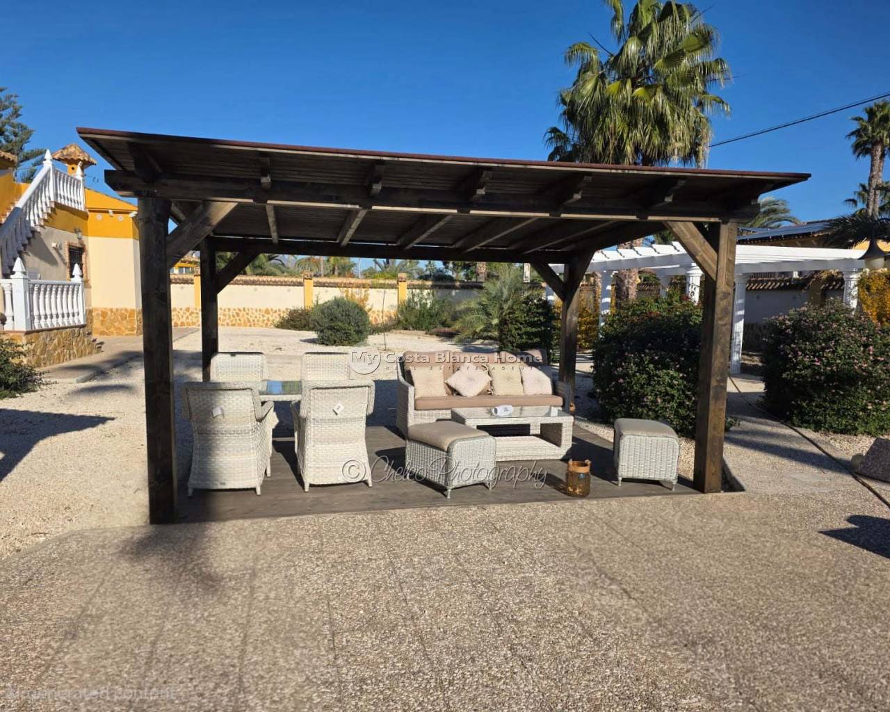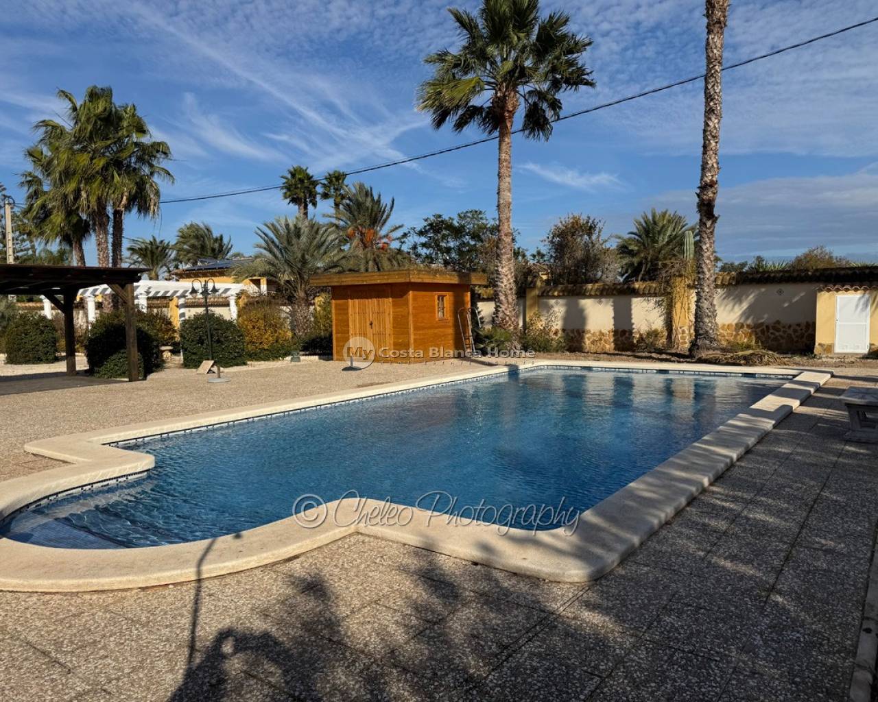 To the front of the property is a wrap around covered porch, there is also a large solarium and an understairs utility room. The plot is laid mainly to gravel and planted with various Mediterrenean trees. There is a huge 12m x 6m swimming pool, a quality timber storage shed, two timber pergolas adjacent to the pool plus 2 concrete pergolas offering additional seating and relaxing areas.