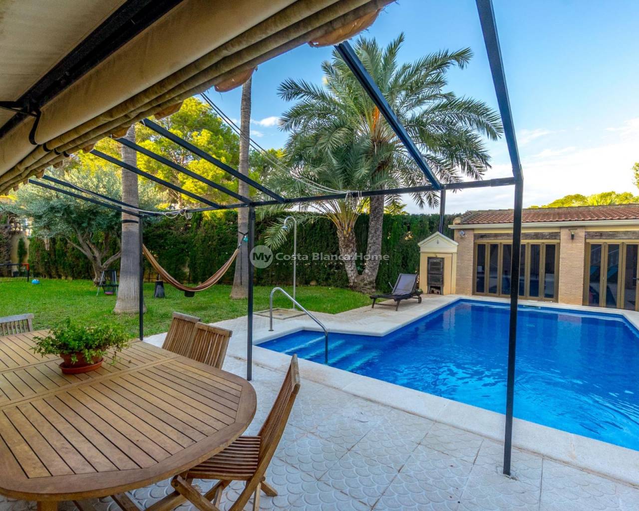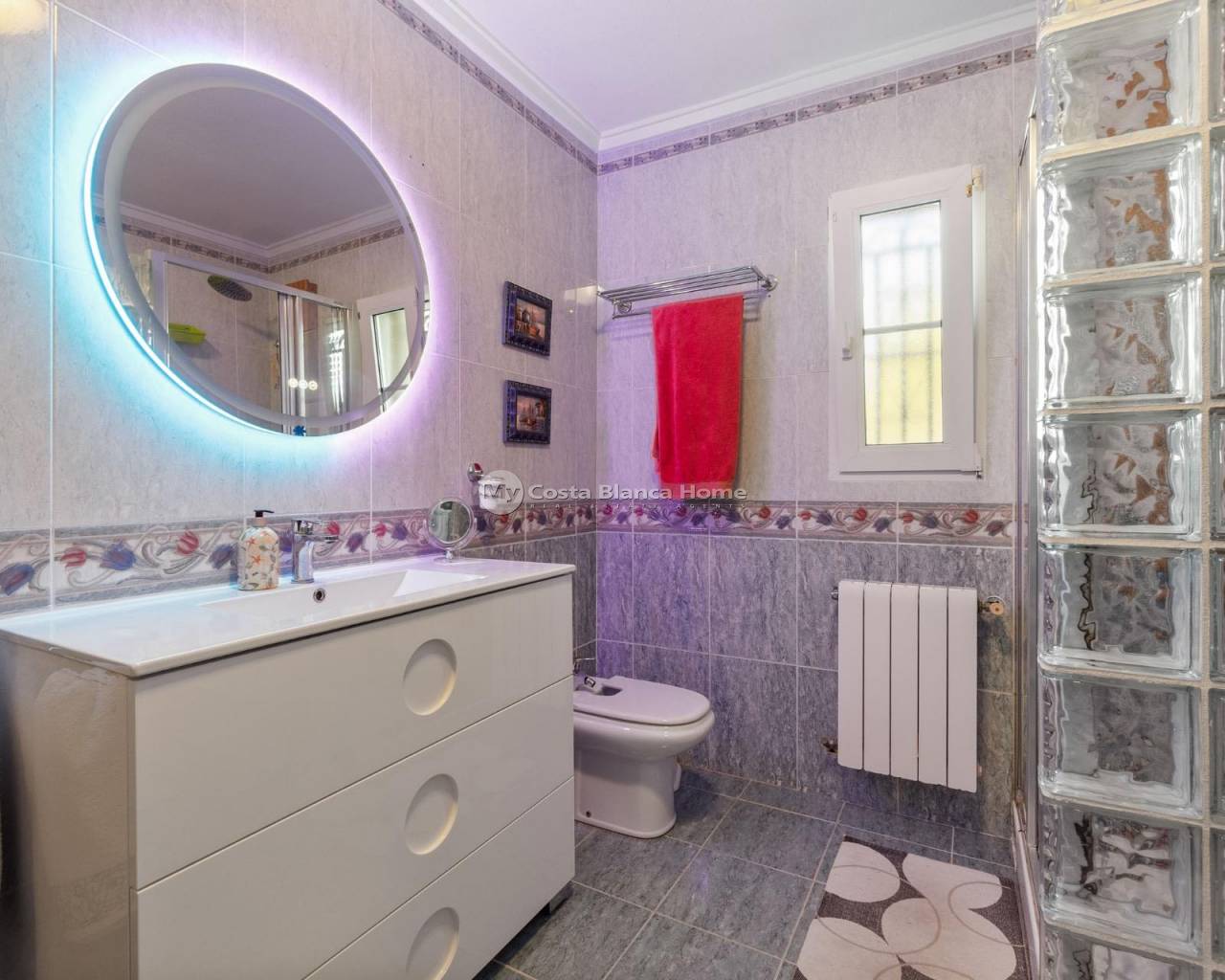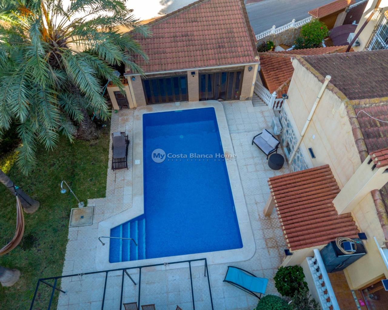Detached villa with private pool and large plot in Los Balcones~~Detached villa with a spacious plot, private pool and wellness area, ideal for year-round living.~~The property has an approximate built area of 200 m2 and stands on a plot of more than 800 m2, located in the prestigious residential area of Los Balcones — a quiet and well-connected area of Torrevieja.~~It offers three bedrooms and three full bathrooms, along with a bright living room and an independent kitchen. All rooms are equipped with heating by radiators (diesel boiler) and air conditioning via split units.~~Outside, the villa features a large garden area with a private pool, a glazed winter room, and a sauna area — perfect for relaxation and comfort.~~There is also a closed garage with space for two vehicles.~~A well-maintained and complete property offering privacy, space, and excellent quality, ideal as a permanent home or as a holiday residence.