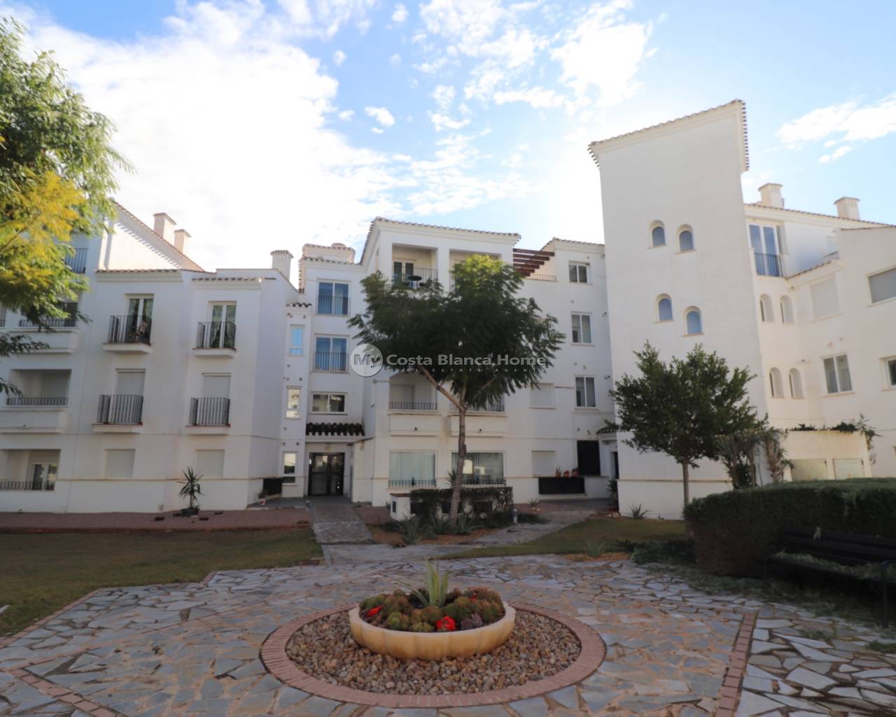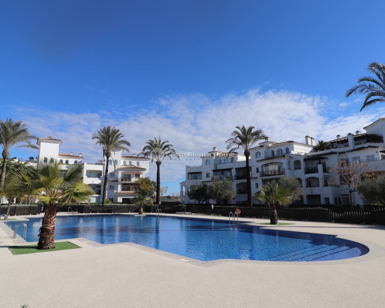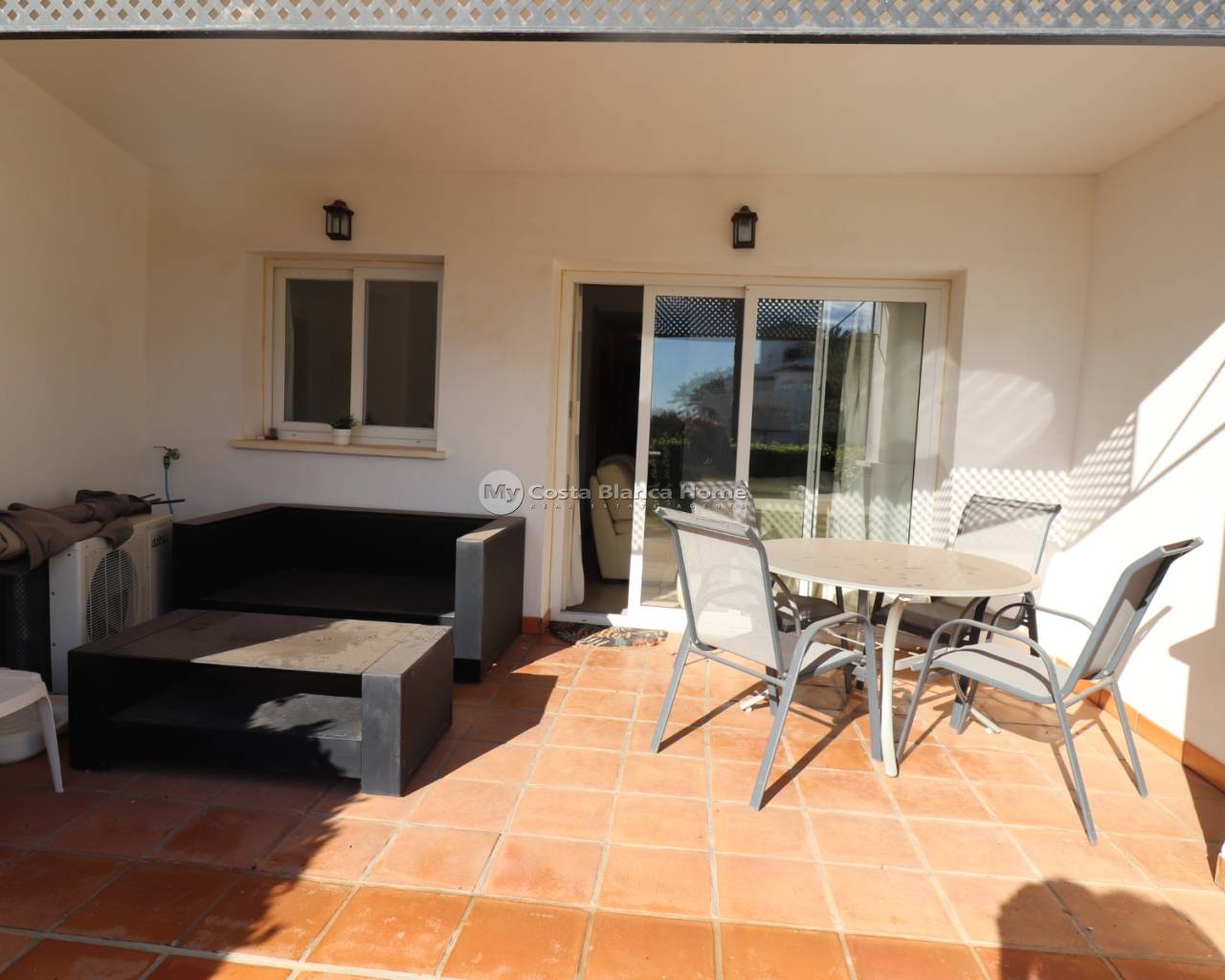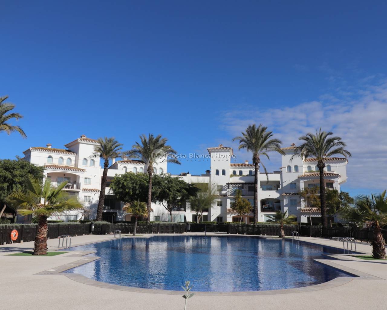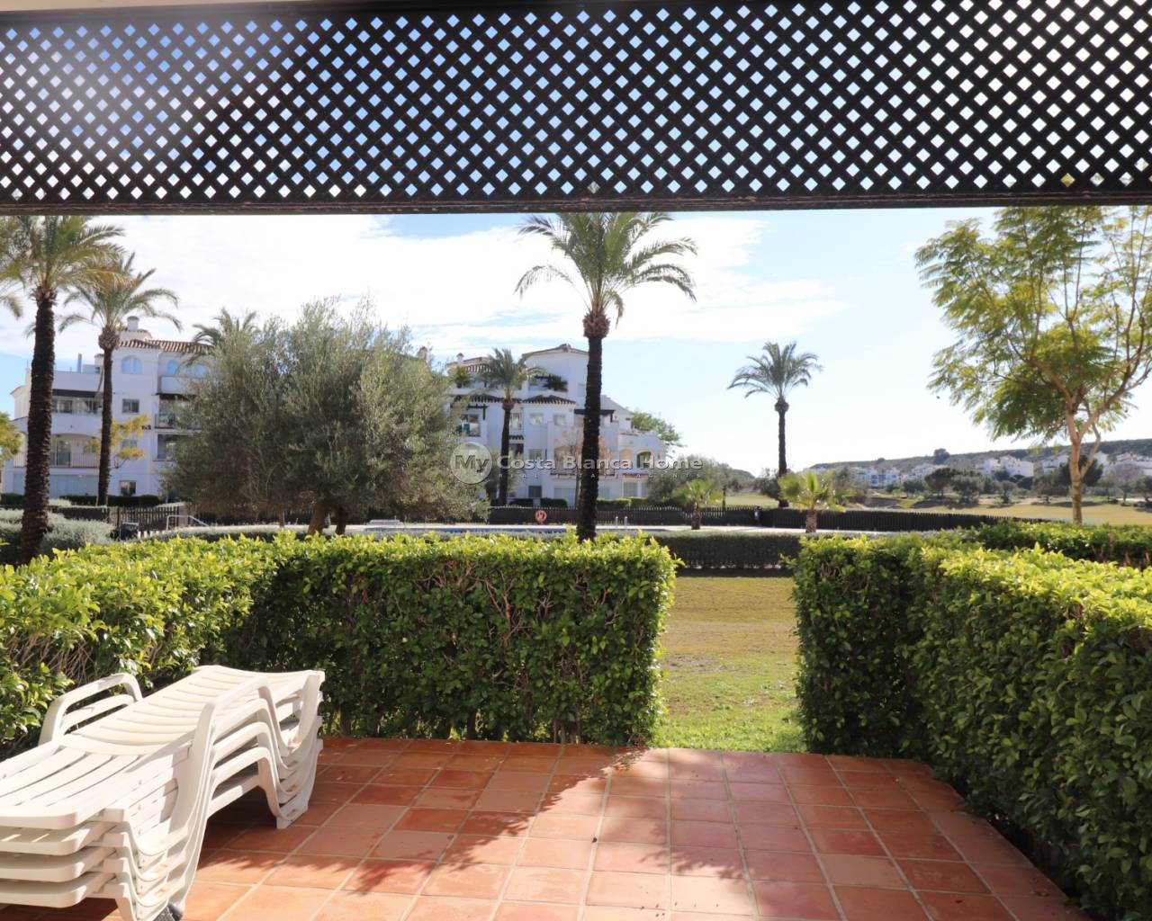 Beautiful ground floor flat on the Hacienda Riquelme golf course in Sucina. The flat comprises a kitchen, 2 bedrooms with fitted wardrobes, a bathroom and a bright living room opening onto a large 30 m² terrace, almost half of which is covered. The terrace leads directly to the magnificent communal swimming pool. The flat has air conditioning in every room. It is sold fully furnished, with a storage room and a parking space in the basement. The Hacienda Riquelme complex is well maintained and secure. The complex has a supermarket, a restaurant, a café and a library. It is located 15 minutes from the beautiful beaches of the Costa Calida and 20 minutes from Murcia Corvera Airport. This flat has a tourist licence, making it an ideal property if you are looking for a rental investment.