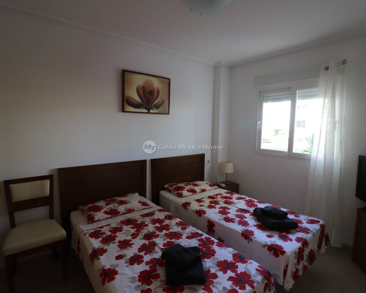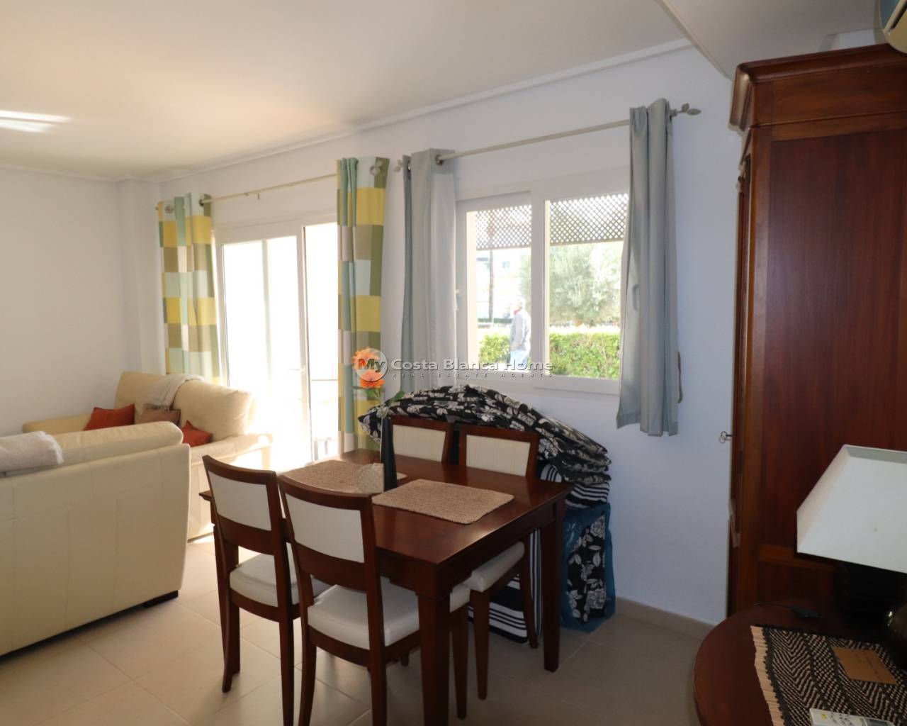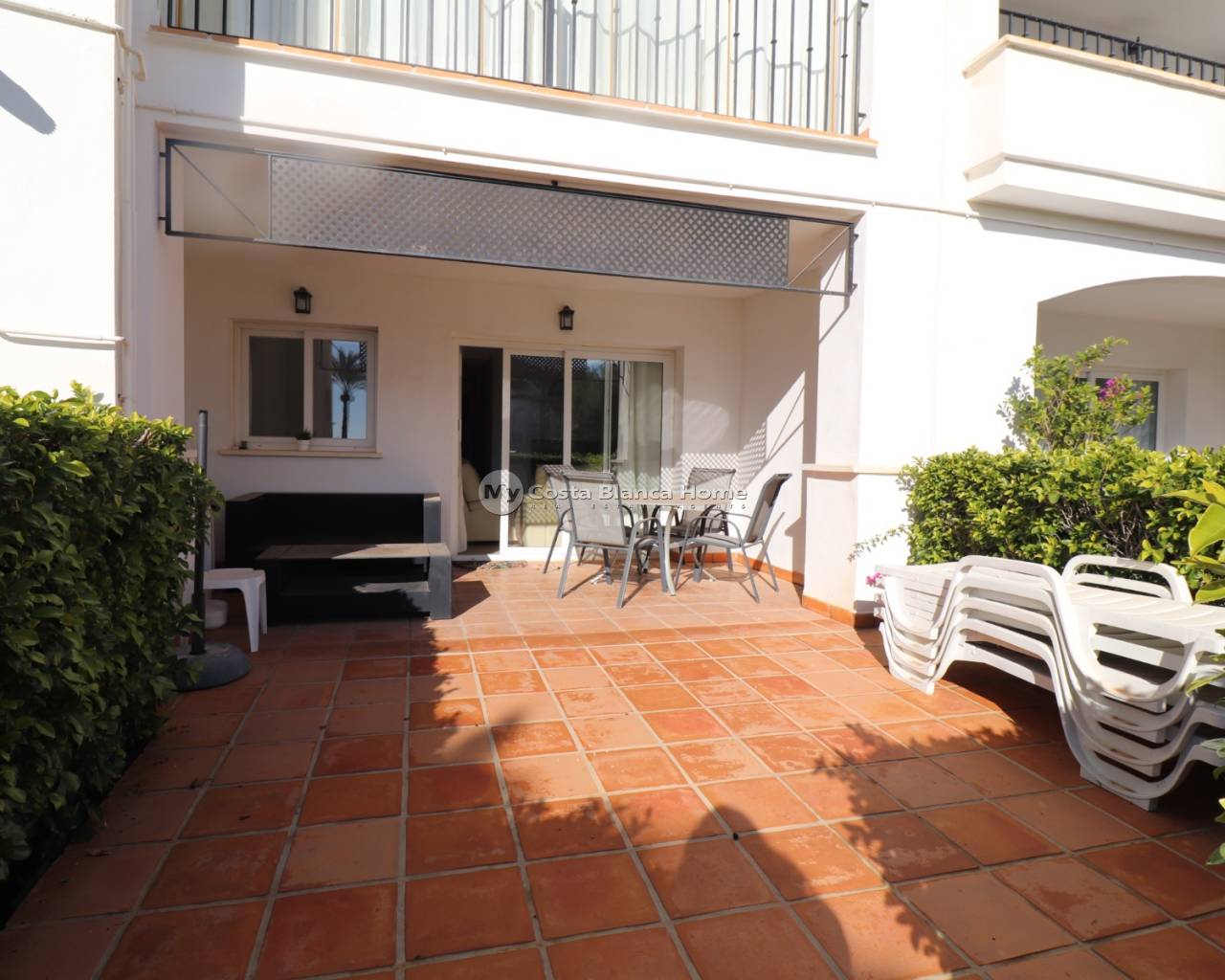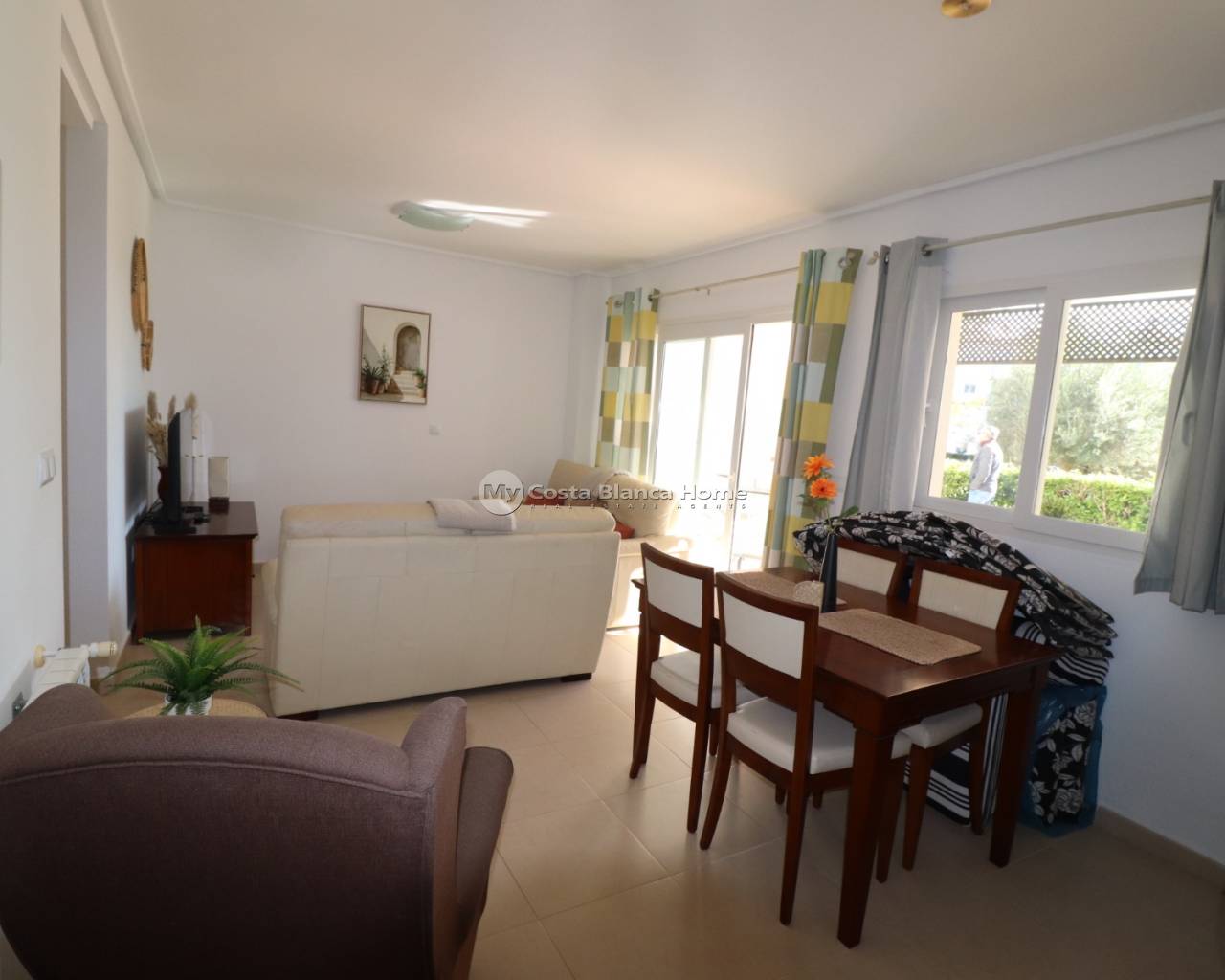 Beautiful ground floor flat on the Hacienda Riquelme golf course in Sucina. The flat comprises a kitchen, 2 bedrooms with fitted wardrobes, a bathroom and a bright living room opening onto a large 30 m² terrace, almost half of which is covered. The terrace leads directly to the magnificent communal swimming pool. The flat has air conditioning in every room. It is sold fully furnished, with a storage room and a parking space in the basement. The Hacienda Riquelme complex is well maintained and secure. The complex has a supermarket, a restaurant, a café and a library. It is located 15 minutes from the beautiful beaches of the Costa Calida and 20 minutes from Murcia Corvera Airport. This flat has a tourist licence, making it an ideal property if you are looking for a rental investment.