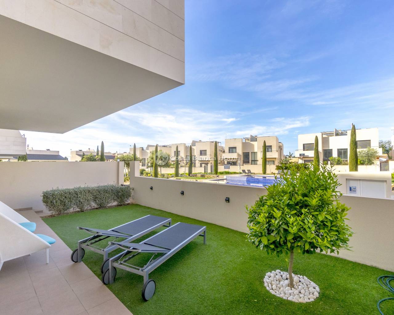 Modern apartment in Jardines de Montesolana, Orihuela Costa. This partment distributed in two bedrooms and two bathrooms. It has a spacious living-dining room with open plan kitchen and direct access to the large garden of 43 m2 with views to the communal areas of the residential with south orientation. It is located in the Jardines de Montesolana development which has a communal swimming pool and garden areas. This residential is close to La Zenia Boulevard shopping centre (Orihuela Costa). La Zenia is close to Cabo Roig, Campoamor and Playa Flamenca. It is a growing area, close to all amenities and the famous La Zenia Boulevard shopping centre. Only a few minutes from the N-332 and the Mediterranean motorway AP-7 towards Alicante and Cartagena. There are also around the golf courses of Villamartin, Las Ramblas, Campoamor and Las Colinas.