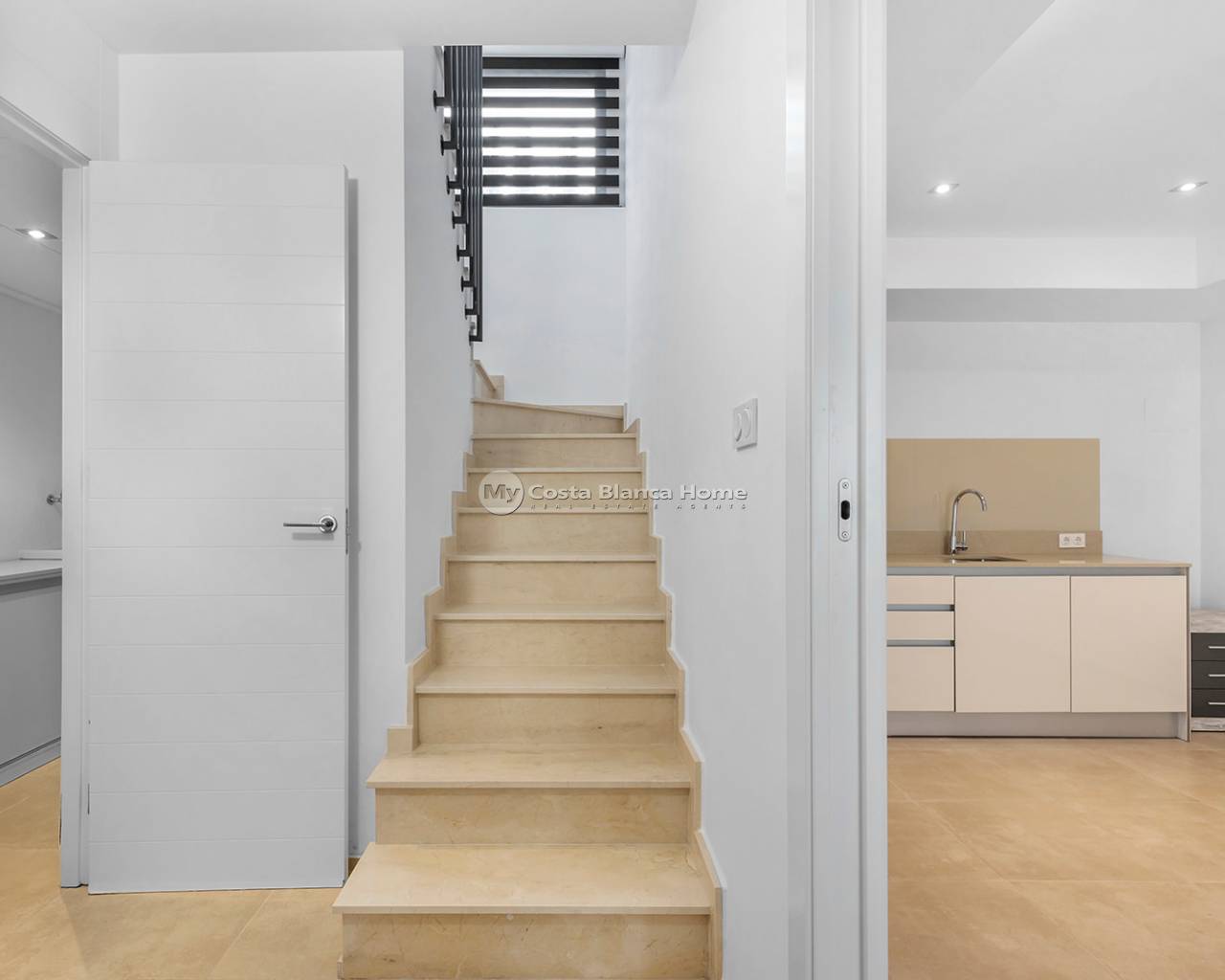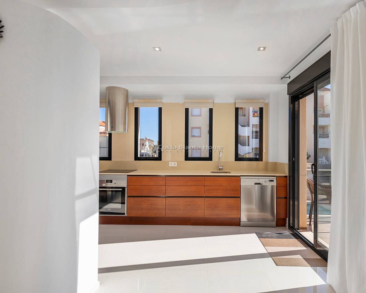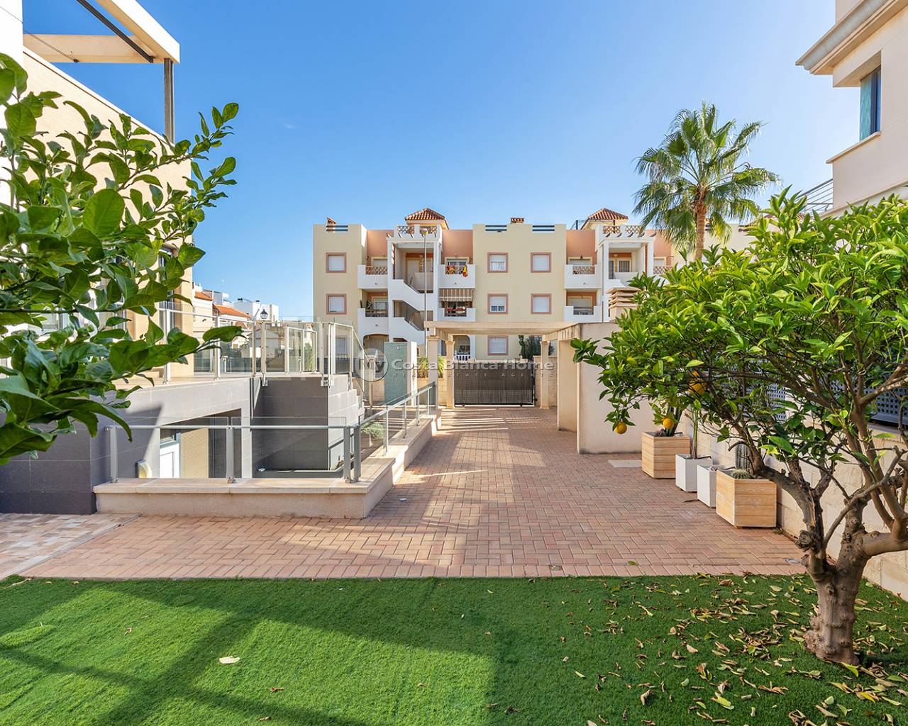 Luxury villa in La Zenia, Orihuela Costa. This villa is situated in an exclusive residential area and has its own private pool and a plot of 410m2. The property has 250m2 built area divided into 4 floors. On the ground floor there is a spacious living room with open plan kitchen, 1 bedroom, 1 bathroom and terrace with access to the pool. On the semi-basement floor there is a living room with open plan kitchen, 2 bedrooms and 1 bathroom. This floor also has a sauna and shower. On the first floor there are 2 bedrooms, each with en-suite bathroom and a large terrace. On the top floor there is a large solarium of 46m2. La Zenia is close to Cabo Roig, Campoamor and Playa Flamenca. It is a tourist area located close to all amenities of the famous La Zenia Boulevard shopping centre. A few minutes from the N-332 and the Mediterranean motorway AP-7 towards Alicante and Cartagena. There are also around the golf courses of Villamartin, Las Ramblas, Campoamor and Las Colinas.