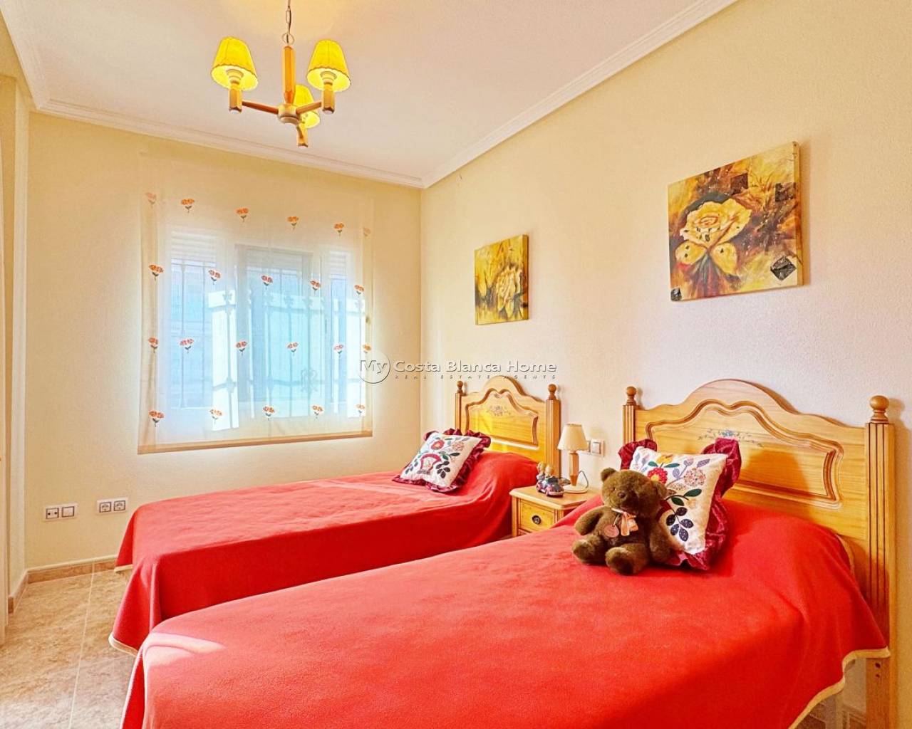 Beautiful corner quad-style duplex located in the exclusive Vista Azul Residential, one of the most desirable developments in Villamartin, Orihuela Costa. This home perfectly combines Mediterranean style, comfort and an excellent location within a quiet, family-friendly environment close to all essential amenities. With 90 m² of built area on a 120 m² plot, the property enjoys a southwest orientation, providing plenty of natural light all day long. The ground floor offers a bright living-dining room with direct access to the terrace, a fully equipped independent kitchen, one bedroom ideal for guests or a home office, and a complete bathroom. The upper floor features two bedrooms with fitted wardrobes, a second bathroom, and access to a 20 m² private solarium, perfect for sunbathing, relaxing or enjoying open views. The property is in excellent condition and equipped with air conditioning, awnings, security door and private parking inside the plot. The spacious terrace surrounding the house provides several outdoor dining and chill-out areas, ideal to enjoy the Mediterranean climate all year round. The Vista Azul complex offers exceptional communal facilities including two swimming pools (one covered), jacuzzi, sauna and gym, making it one of the most complete and sought-after communities in Villamartin. Located next to Villamartin Golf Course, close to La Zenia Boulevard and Playa Flamenca, and only 3 km from the beaches of Orihuela Costa, this home is perfect for those looking to buy a duplex in Villamartin or invest in a property for sale on the Costa Blanca. A charming property, ready to move into — ideal as a permanent home, a holiday residence or a real estate investment in Orihuela Costa.