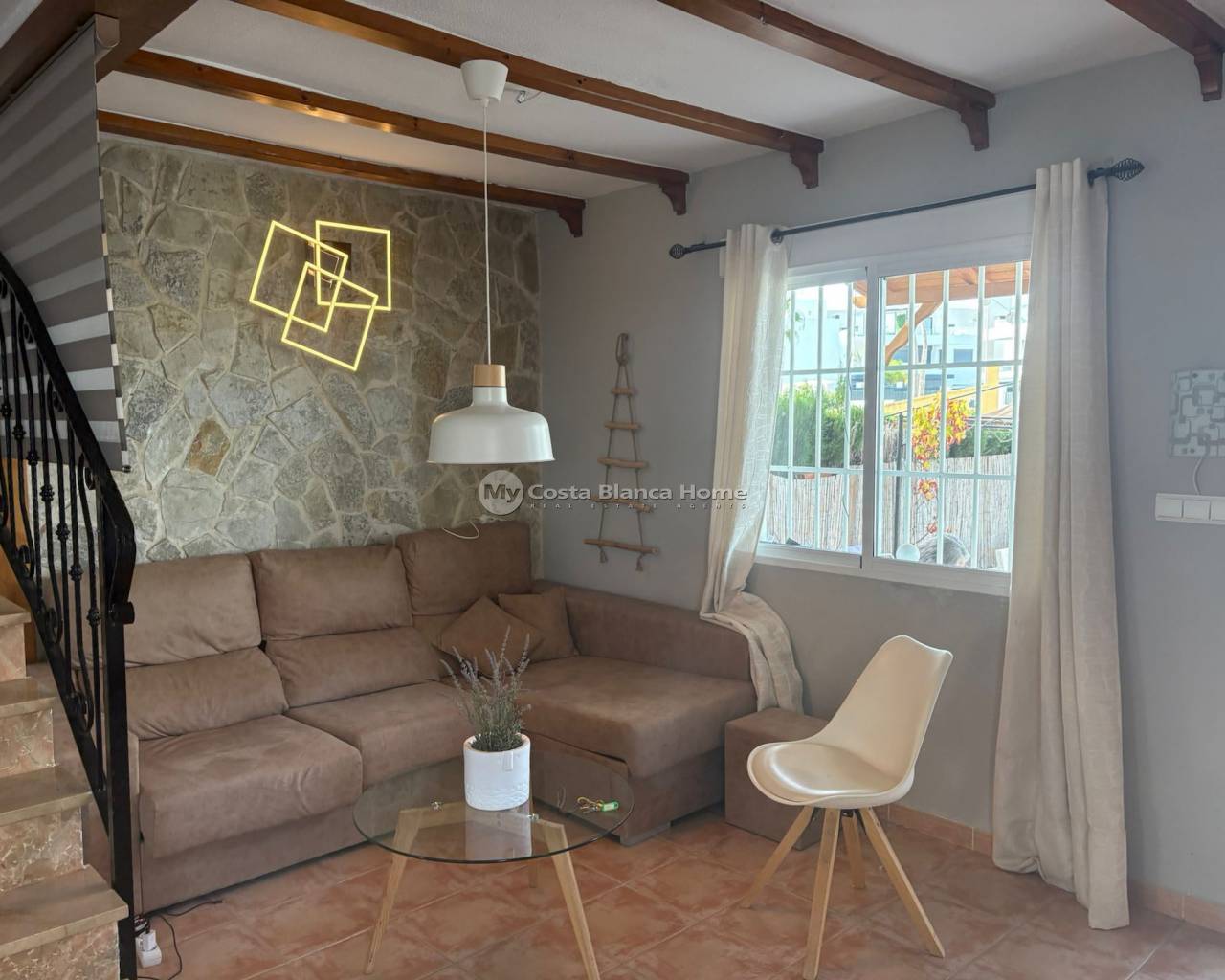 For sale is a charming townhouse in the sought-after area of Montemar, Algorfa, offering a comfortable internal space of 90 m2. This well-maintained resale property features three spacious bedrooms and two bathrooms, perfect for families or those wanting extra space for guests or a home office. One of the bedrooms and bathrooms are on the ground floor. The different outside spaces are perfect for relaxing or entertaining, offering sun or shade throught the day. The surroundings are known for a relaxed lifestyle, scenic walking paths, and access to beautiful landscapes, making it an ideal choice for anyone seeking both nature and convenience. The townhouse is west facing, allowing for plenty of afternoon sunlight to filter into your living spaces. It is offered unfurnished, giving you the freedom to design and decorate according to your own taste. Residents have access to a lovely communal swimming pool, perfect for relaxing or socialising with friends and neighbours. Amenities such as shops, cafes, and services are just a short stroll away, making daily living convenient and enjoyable. If you are looking for a quality home in a welcoming area, this property is the perfect choice. EXTRAS INCLUDE Air conditioning units x 2 Sun awnings Wood burner in lounge New Kitchen Contact us today to arrange a viewing and make this townhouse your new home.