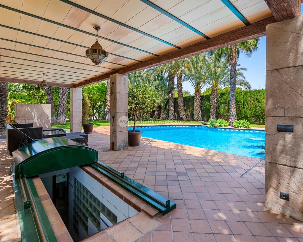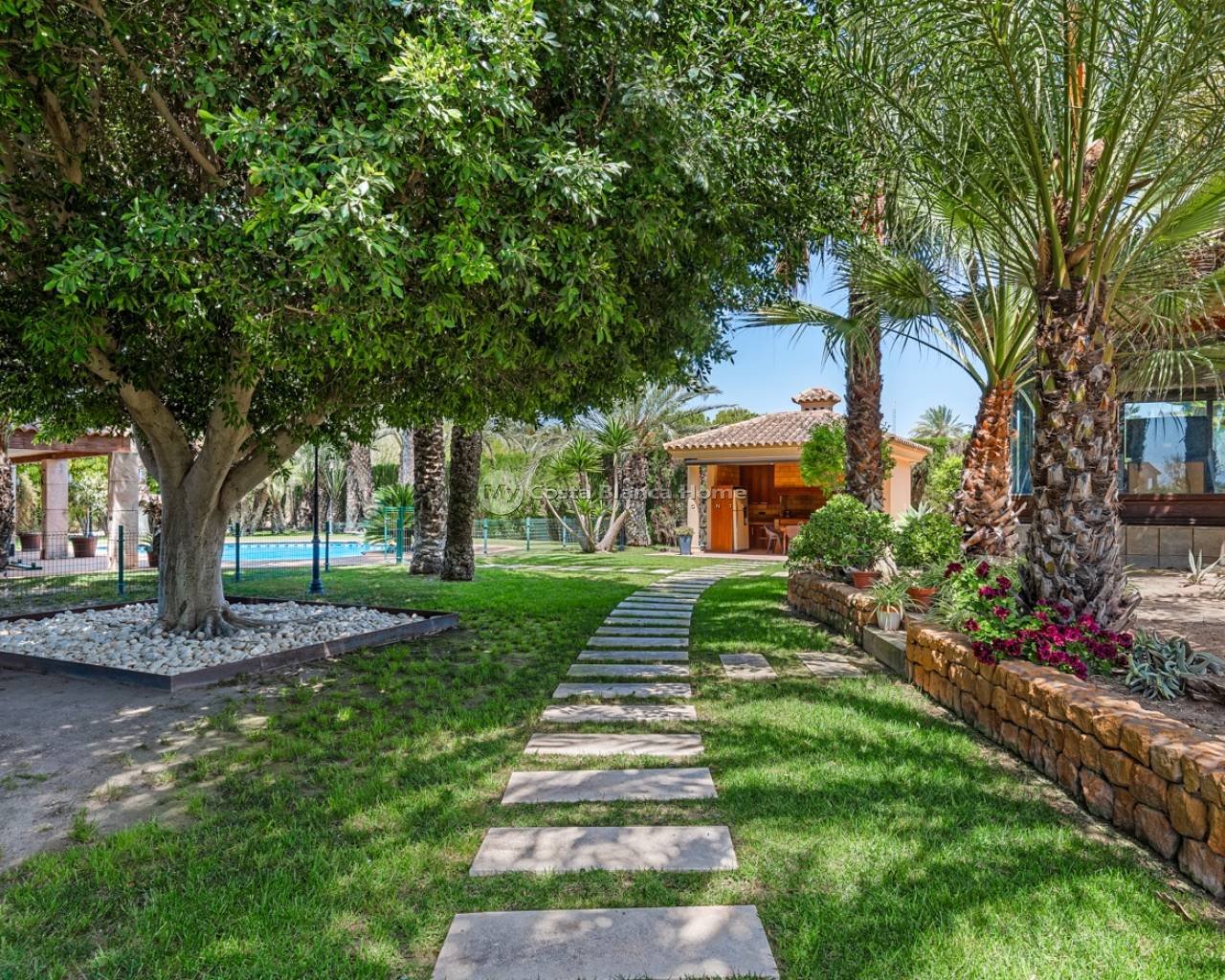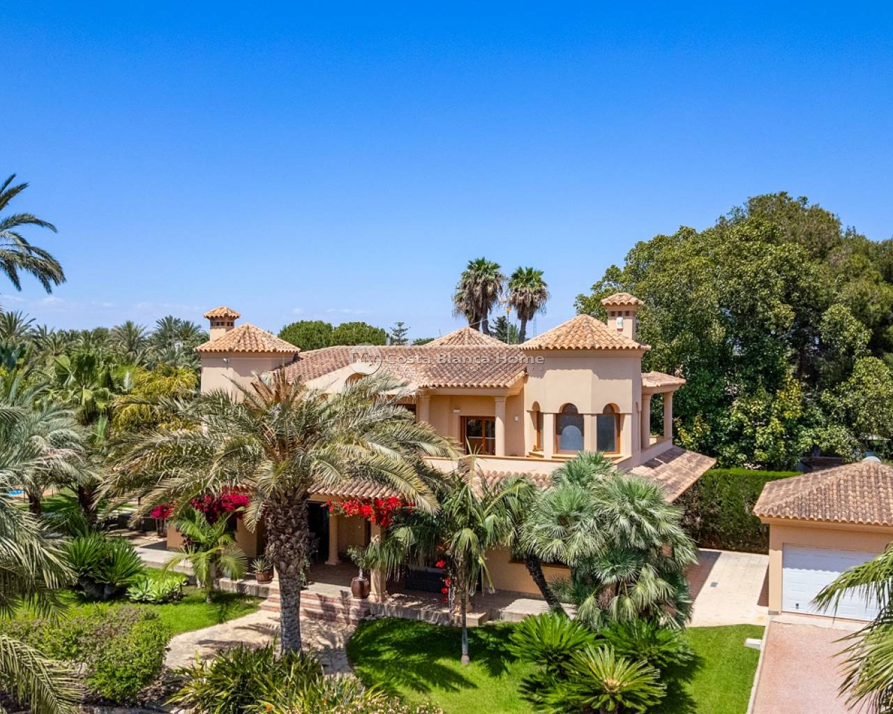 Welcome to this beautiful property located in a popular neighborhood in Elche. The finca sits on a big plot of 4.750 m2. Most of the house is completely renovated since 2019. The main house consists of two floors. On the main floor you will find a spacious foyer, a living room and dining area, a newly renovated kitchen, laundry room, a bedroom, a bathroom, and a family room/glazed terrace with wonderful views to the garden and pool. On the second floor you will find four double bedrooms and two bathrooms, and a total of three balconies.From the main bedroom you also have access to a big walk-in-closet. The basement is very spacious and has a lot of potential. Today it is used as a gym/kids-room. On this floor you will also find the electrical room. The property has spacious and well maintained outside areas. Before entering the property, you will find a big porch with lots of shade for the warm summer days. The garden is beautiful, and here you will also find a fully equipped outside kitchen. By the pool there is also a very clever under built that consists of two dressing rooms, storage, a bathroom and a shower. This under built is covered, and you access it by stairs. On the plot you also have a double garage with an automatic door. For more information, or to schedule a viewing, contact us!