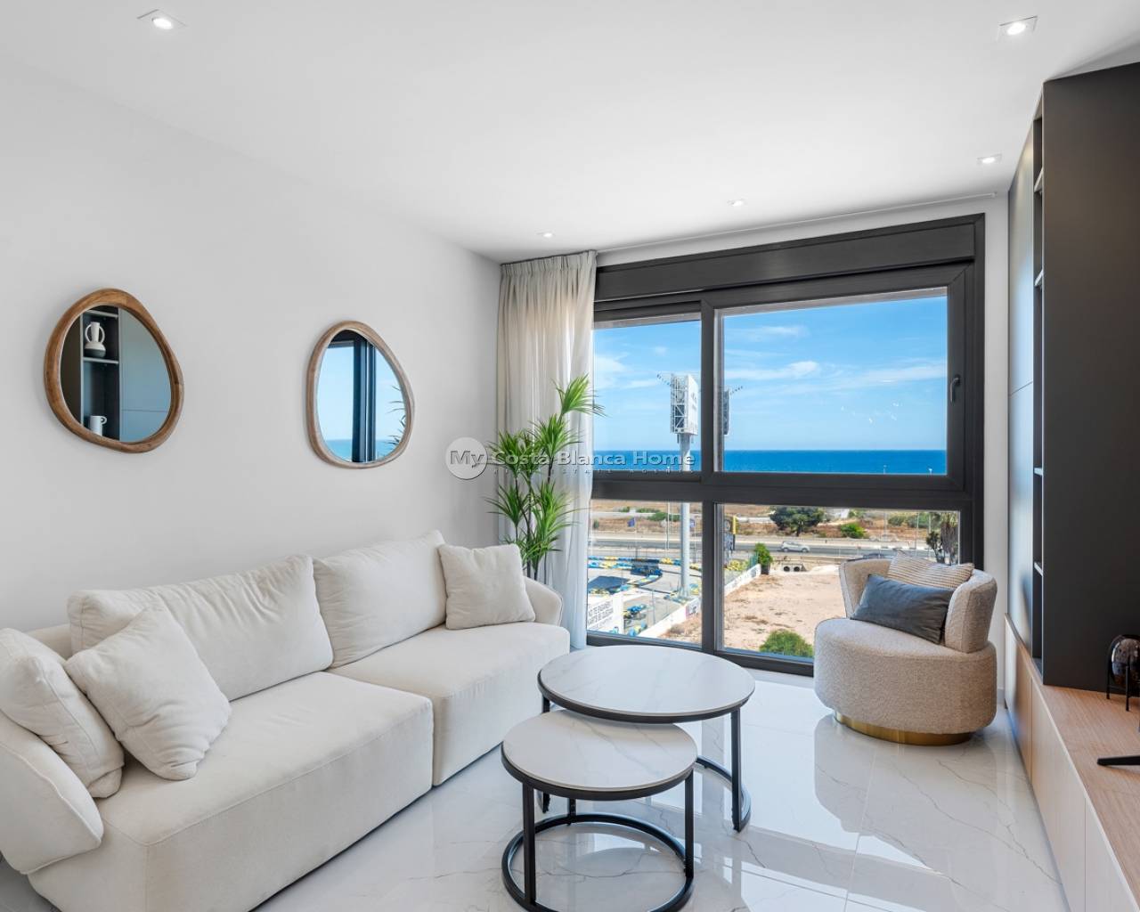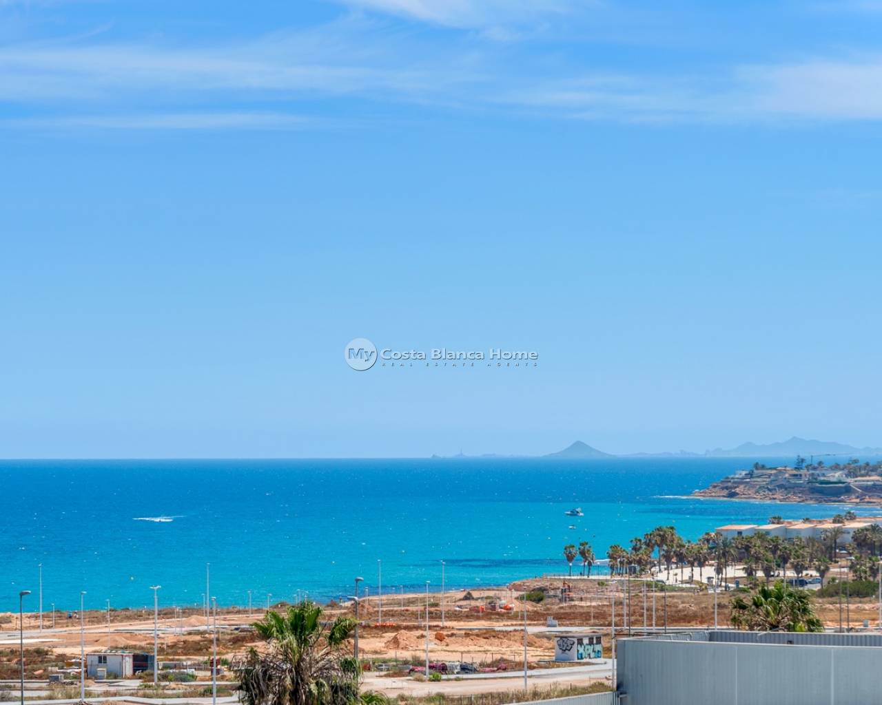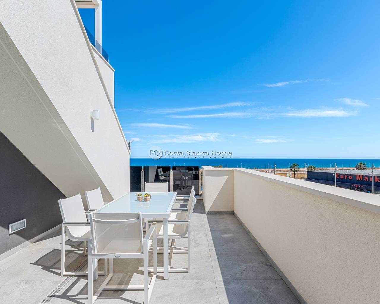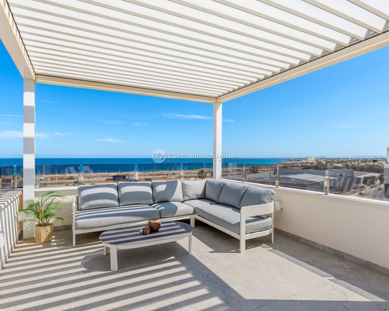 Located in the exclusive Amanecer Deluxe residential complex, this two-storey apartment offers an excellent combination of location, comfort and sea views. Situated in Orihuela Costa, just steps from the Mediterranean and close to all essential services, it is ideal as a permanent residence or holiday investment. The property features three bedrooms, two bathrooms (one en suite), an independent kitchen, and a spacious living-dining area. All rooms, including the kitchen, have direct access to a continuous balcony with sea views and space to sit and enjoy the outdoors. It is sold fully furnished and equipped with high-quality materials: PVC windows with electric shutters, underfloor heating in bathrooms, and modern finishes. On the upper floor, you'll find a private solarium with a swimming pool, perfect for relaxing in complete privacy. The apartment also includes a large, enclosed parking space within the complex. The residential offers communal green areas, a swimming pool and a children's playground, all in a quiet and well-maintained setting.