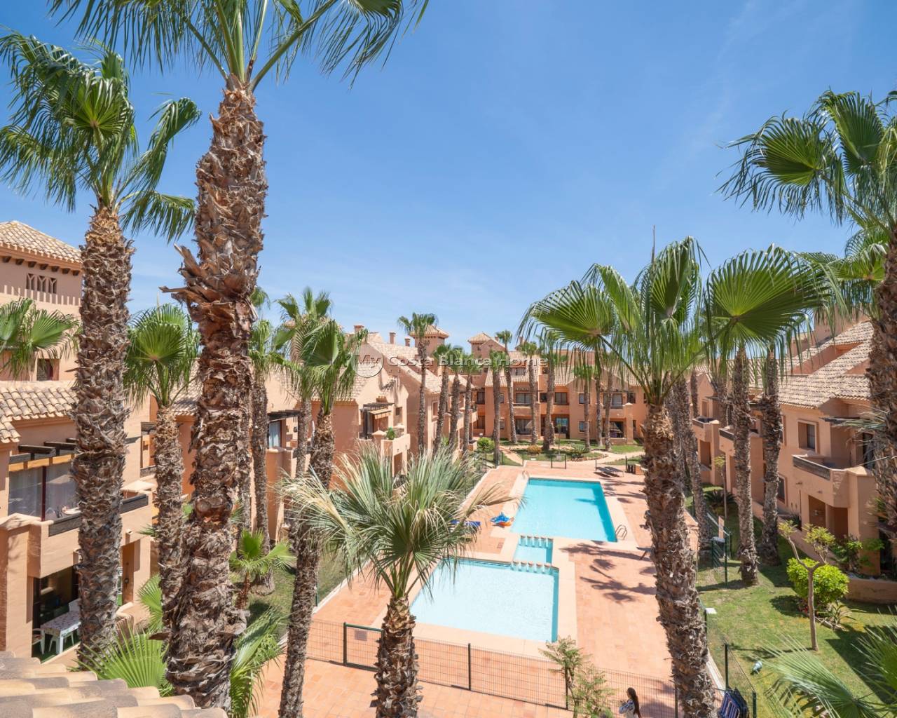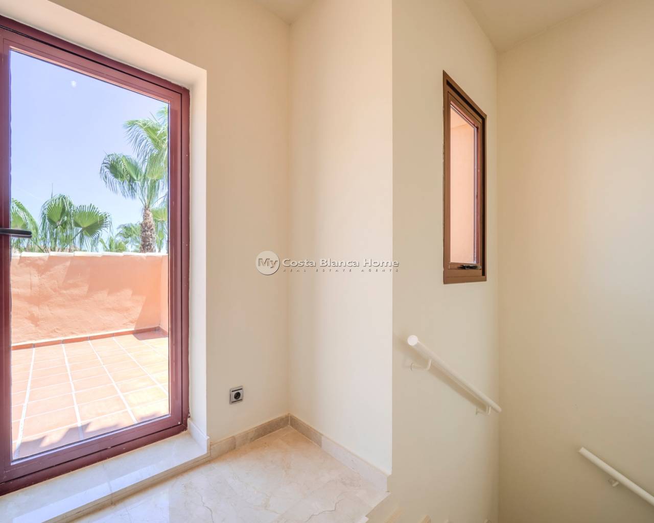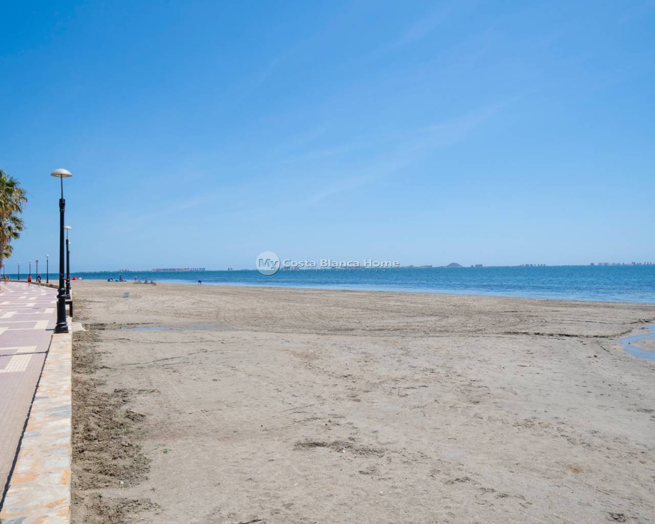 This exclusive 3-bedroom penthouse duplex is located in the prestigious Nueva Ribera Beach Club urbanization, right on the front line of the best beach in Mar Menor. With a built area of 97.78 m² spread over two floors, this property offers the perfect combination of comfort, style, and a privileged location. On the main floor, there is a bright and spacious living-dining room with access to a balcony overlooking the communal pool, a fully equipped independent kitchen, a full bathroom, a secondary bedroom, and a master bedroom with access to another balcony facing the landscaped communal pool area. The upper floor features an additional bedroom, a full bathroom, a convenient storage room, and a large private solarium terrace, ideal for relaxing outdoors and enjoying the Mediterranean climate year-round. The property includes a garage space and storage room in the price. It stands out for its excellent quality finishes: armored front door, white lacquered interior doors, and high-quality built-in wardrobes. The gated urbanization offers extensive green areas, a communal swimming pool, and 24-hour security surveillance, all within a peaceful and secure environment just steps from the sea, allowing you to enjoy sun, beach, and a unique lifestyle on the Mar Menor.