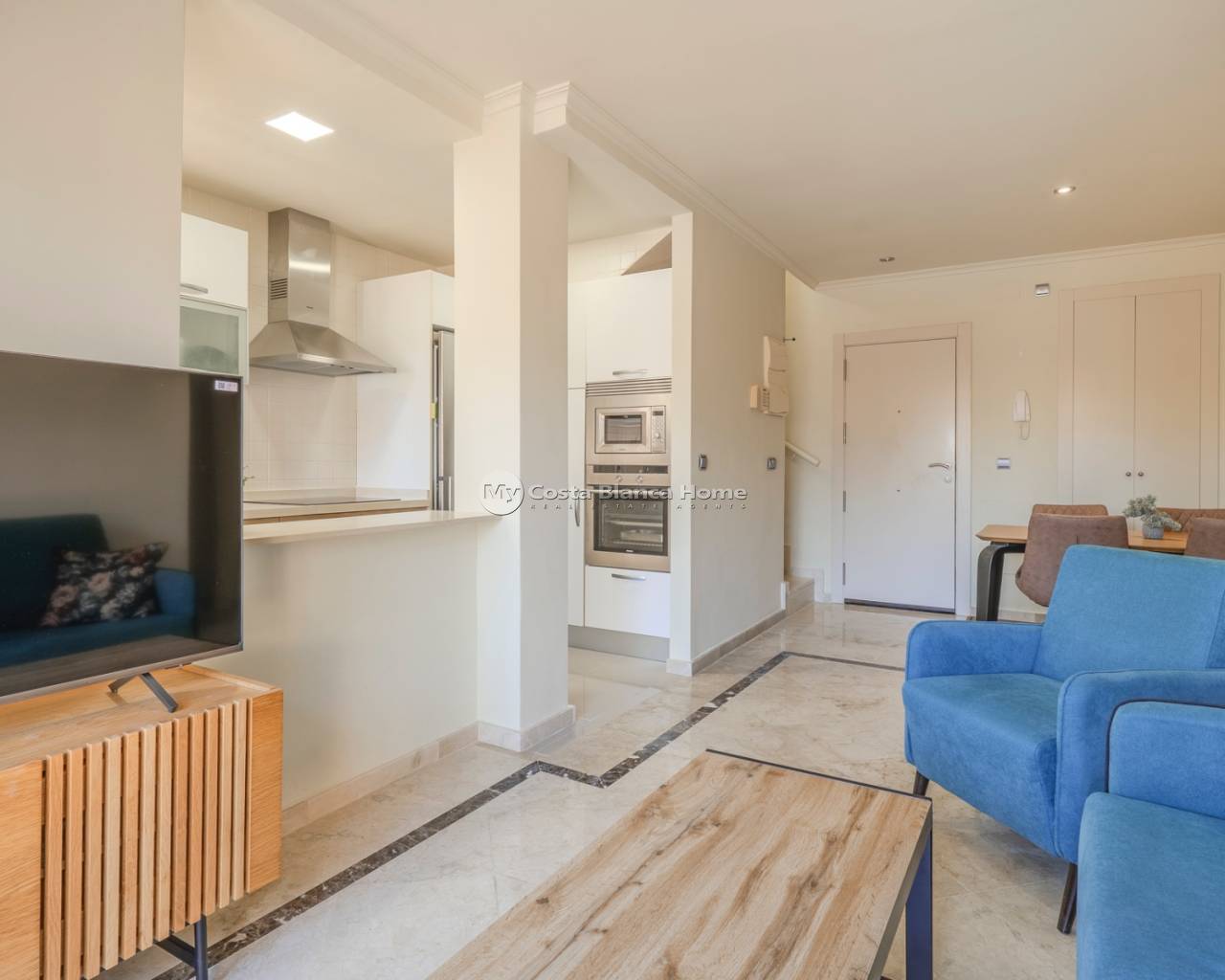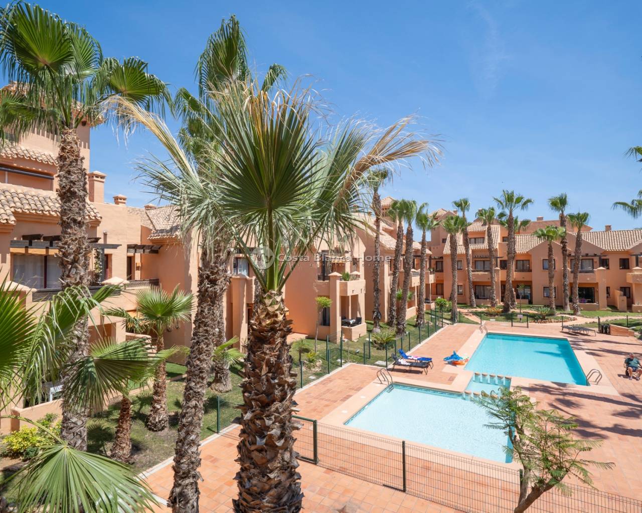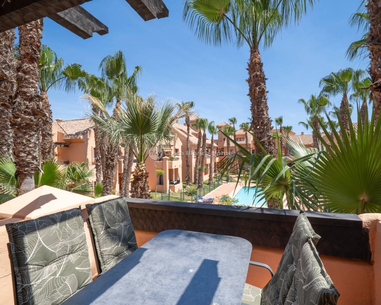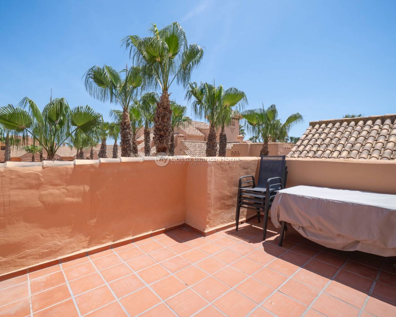 This exclusive 3-bedroom penthouse duplex is located in the prestigious Nueva Ribera Beach Club urbanization, right on the front line of the best beach in Mar Menor. With a built area of 97.78 m² spread over two floors, this property offers the perfect combination of comfort, style, and a privileged location. On the main floor, there is a bright and spacious living-dining room with access to a balcony overlooking the communal pool, a fully equipped independent kitchen, a full bathroom, a secondary bedroom, and a master bedroom with access to another balcony facing the landscaped communal pool area. The upper floor features an additional bedroom, a full bathroom, a convenient storage room, and a large private solarium terrace, ideal for relaxing outdoors and enjoying the Mediterranean climate year-round. The property includes a garage space and storage room in the price. It stands out for its excellent quality finishes: armored front door, white lacquered interior doors, and high-quality built-in wardrobes. The gated urbanization offers extensive green areas, a communal swimming pool, and 24-hour security surveillance, all within a peaceful and secure environment just steps from the sea, allowing you to enjoy sun, beach, and a unique lifestyle on the Mar Menor.