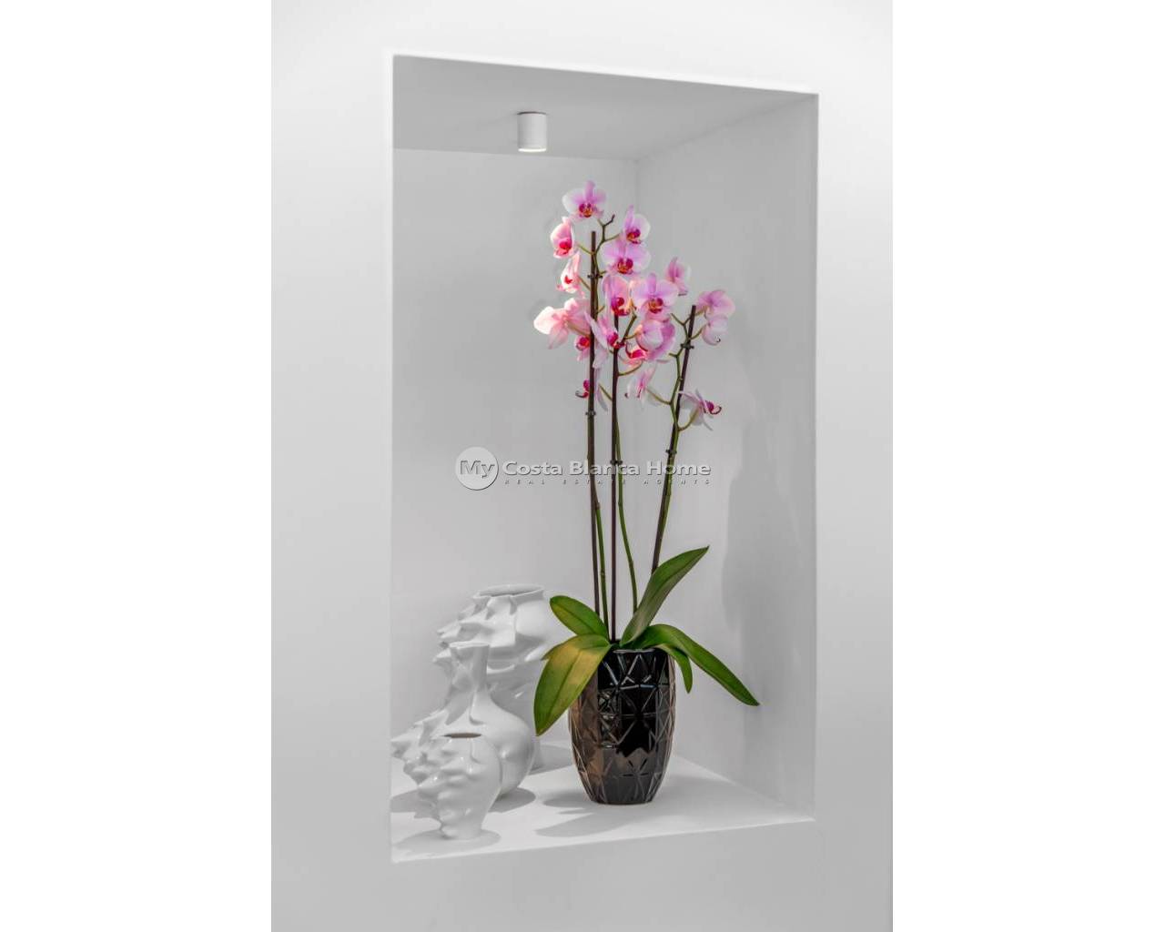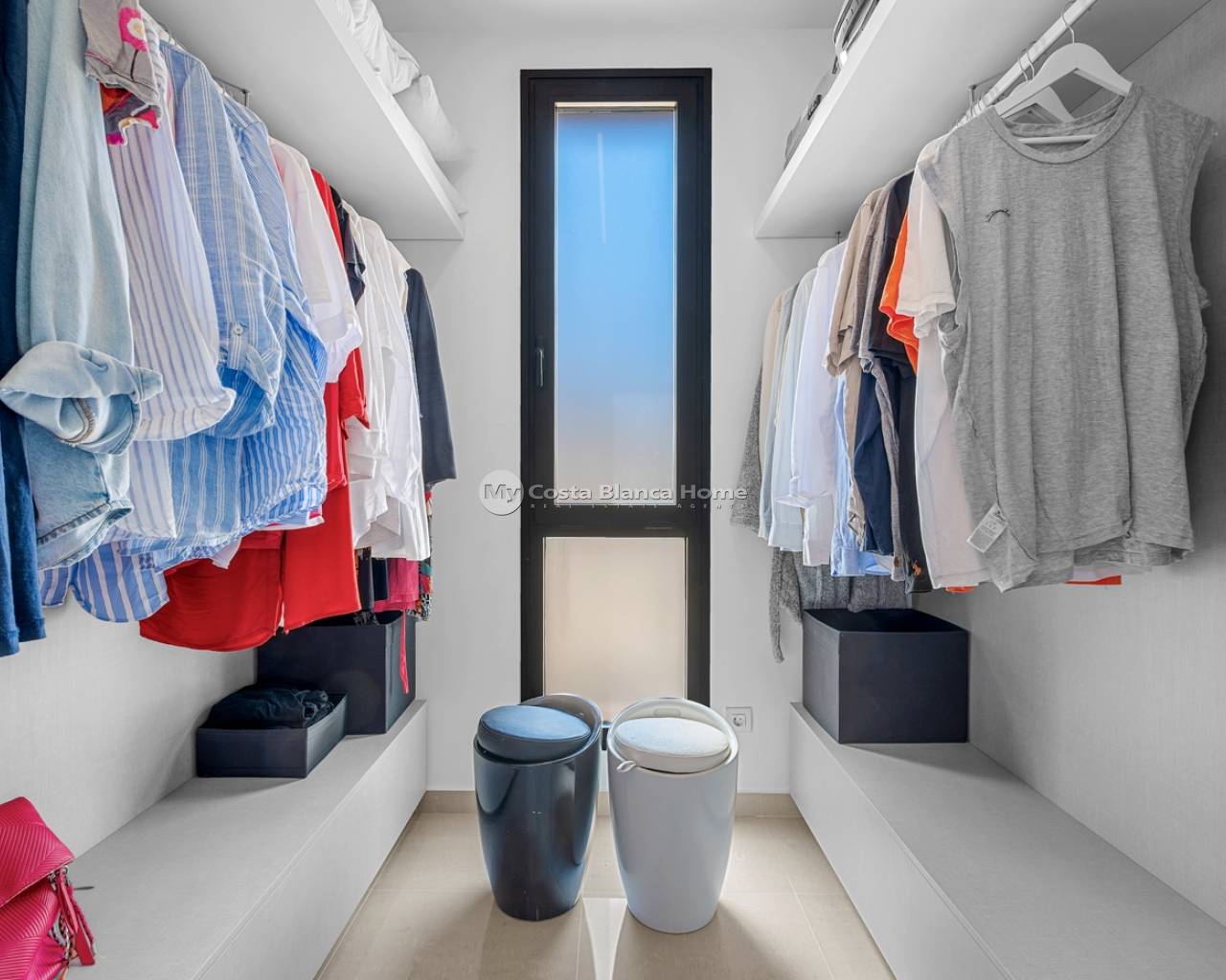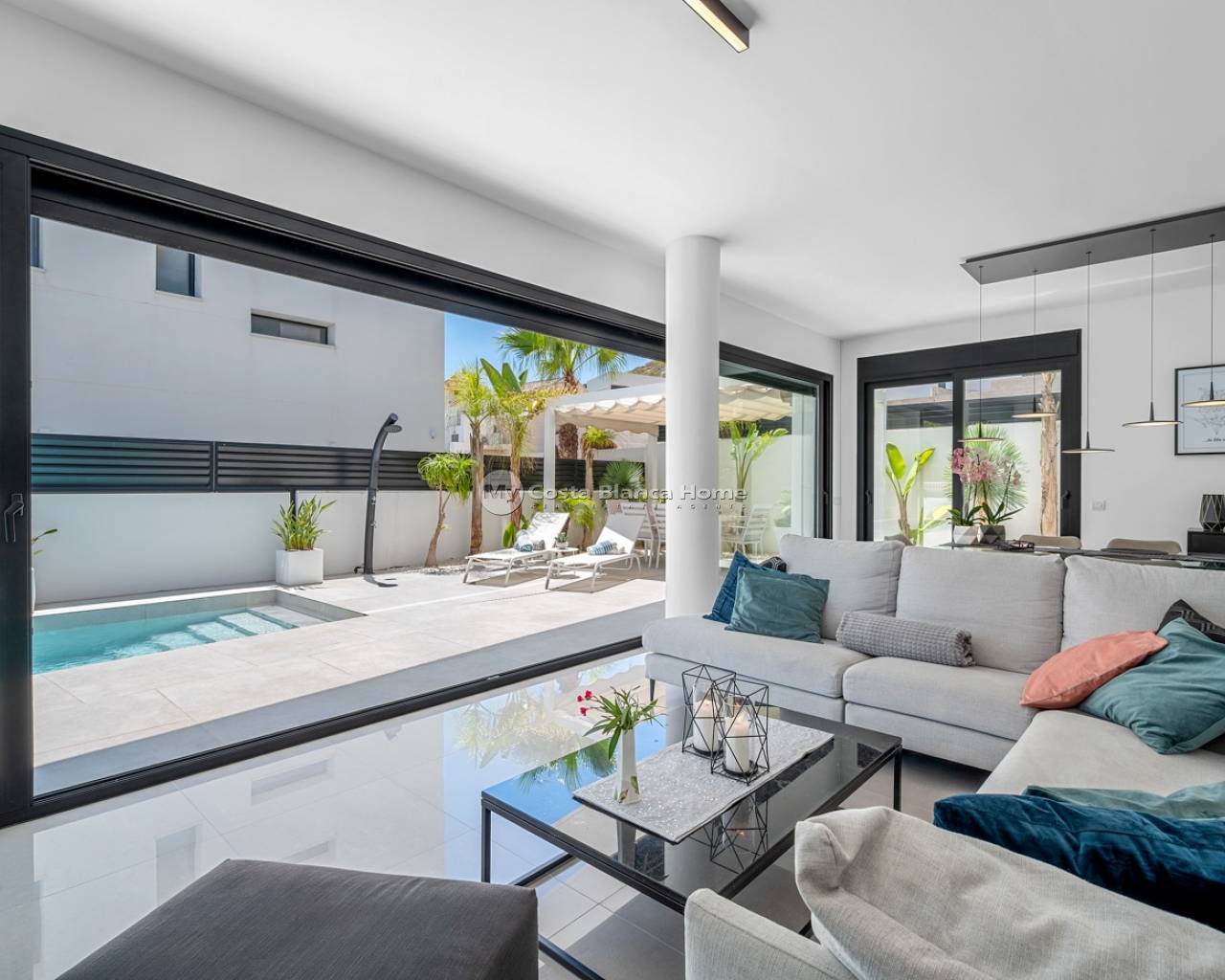 Situated on a 347m² plot, this contemporary villa—built in 2019—offers a refined blend of modern architecture and comfortable living. Spanning 194m² across three levels, the home features four generously sized bedrooms and three bathrooms, with a layout designed for both privacy and functionality. The open-plan kitchen flows into the dining and living areas, creating a bright, spacious environment with direct access to the garden and terrace through large sliding glass doors, inviting natural light throughout the day. The main entrance is positioned on the north side of the property, while the garden and pool area enjoy a sunny south-facing orientation. Outside, the 36m² private swimming pool serves as a focal point, surrounded by clean, modern landscaping and a selection of lounging and dining areas. A pergola provides a shaded retreat for outdoor meals, and a covered terrace extends the living space outdoors. The rooftop solarium offers open views and a relaxing spot to enjoy the surrounding environment, including partial sea views. Upstairs, the primary suite includes a walk-in closet and access to a private balcony, while two additional bedrooms with built-in wardrobes complete the upper level. A fourth bedroom is located on the ground floor, ideal for guests or flexible use. Additional conveniences include a separate laundry room, a storage area, and private parking on the plot. With its thoughtful layout, quality finishes, and excellent orientation, this home presents a modern lifestyle just minutes from the sea.