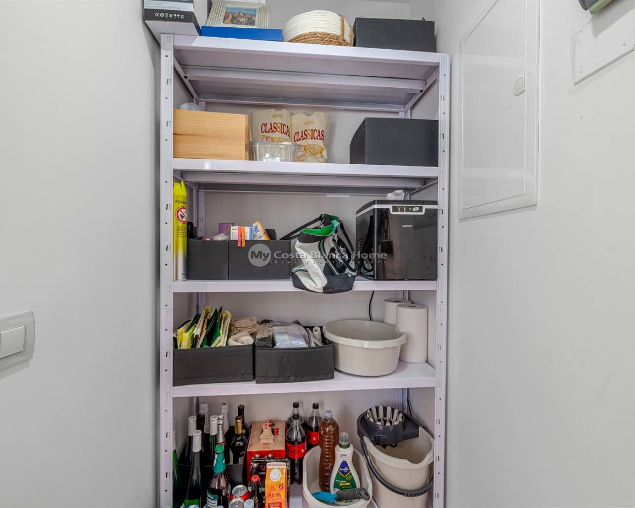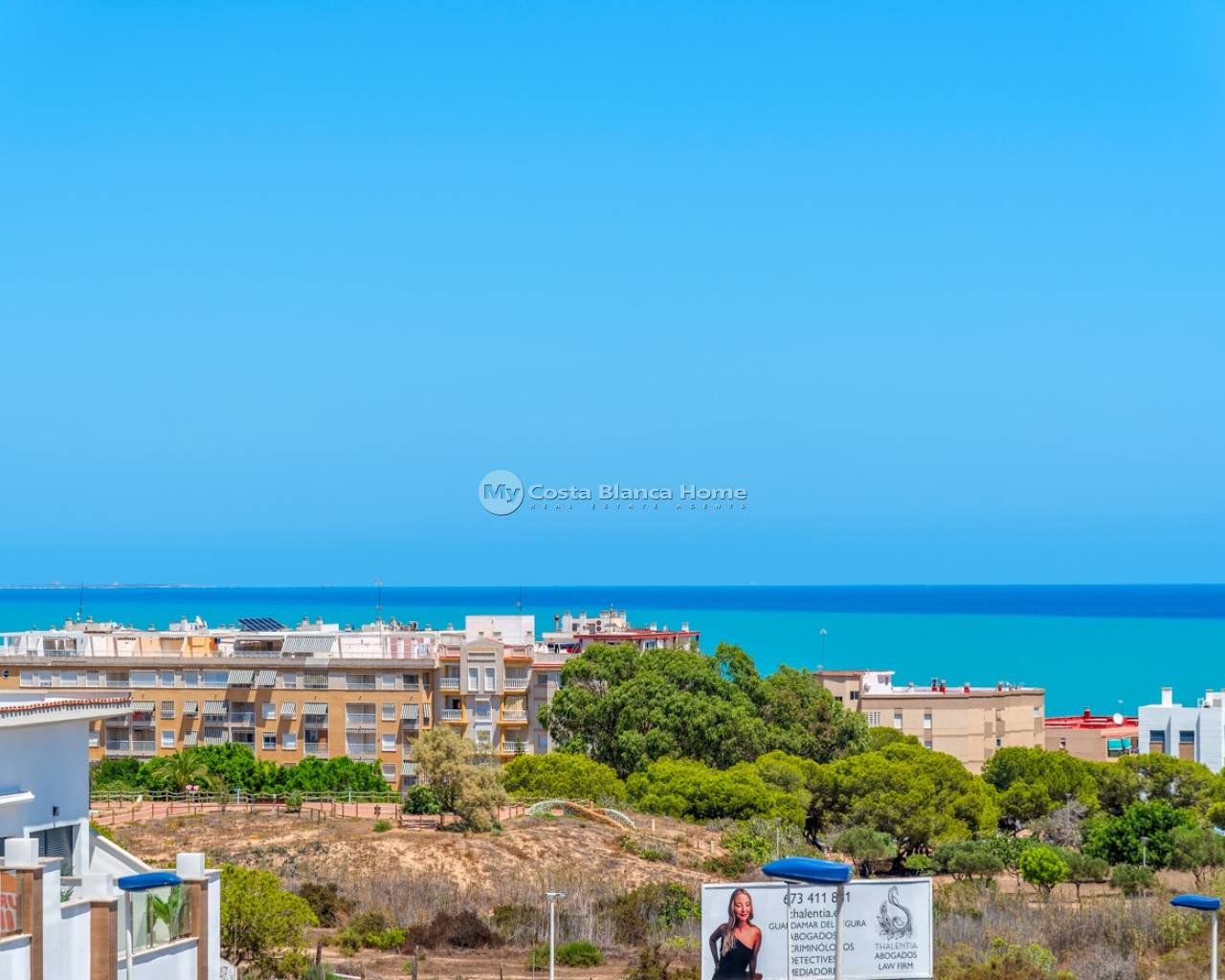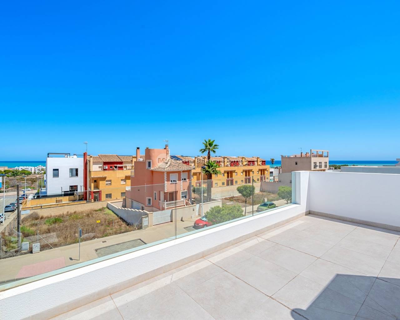 Situated on a 347m² plot, this contemporary villa—built in 2019—offers a refined blend of modern architecture and comfortable living. Spanning 194m² across three levels, the home features four generously sized bedrooms and three bathrooms, with a layout designed for both privacy and functionality. The open-plan kitchen flows into the dining and living areas, creating a bright, spacious environment with direct access to the garden and terrace through large sliding glass doors, inviting natural light throughout the day. The main entrance is positioned on the north side of the property, while the garden and pool area enjoy a sunny south-facing orientation. Outside, the 36m² private swimming pool serves as a focal point, surrounded by clean, modern landscaping and a selection of lounging and dining areas. A pergola provides a shaded retreat for outdoor meals, and a covered terrace extends the living space outdoors. The rooftop solarium offers open views and a relaxing spot to enjoy the surrounding environment, including partial sea views. Upstairs, the primary suite includes a walk-in closet and access to a private balcony, while two additional bedrooms with built-in wardrobes complete the upper level. A fourth bedroom is located on the ground floor, ideal for guests or flexible use. Additional conveniences include a separate laundry room, a storage area, and private parking on the plot. With its thoughtful layout, quality finishes, and excellent orientation, this home presents a modern lifestyle just minutes from the sea.