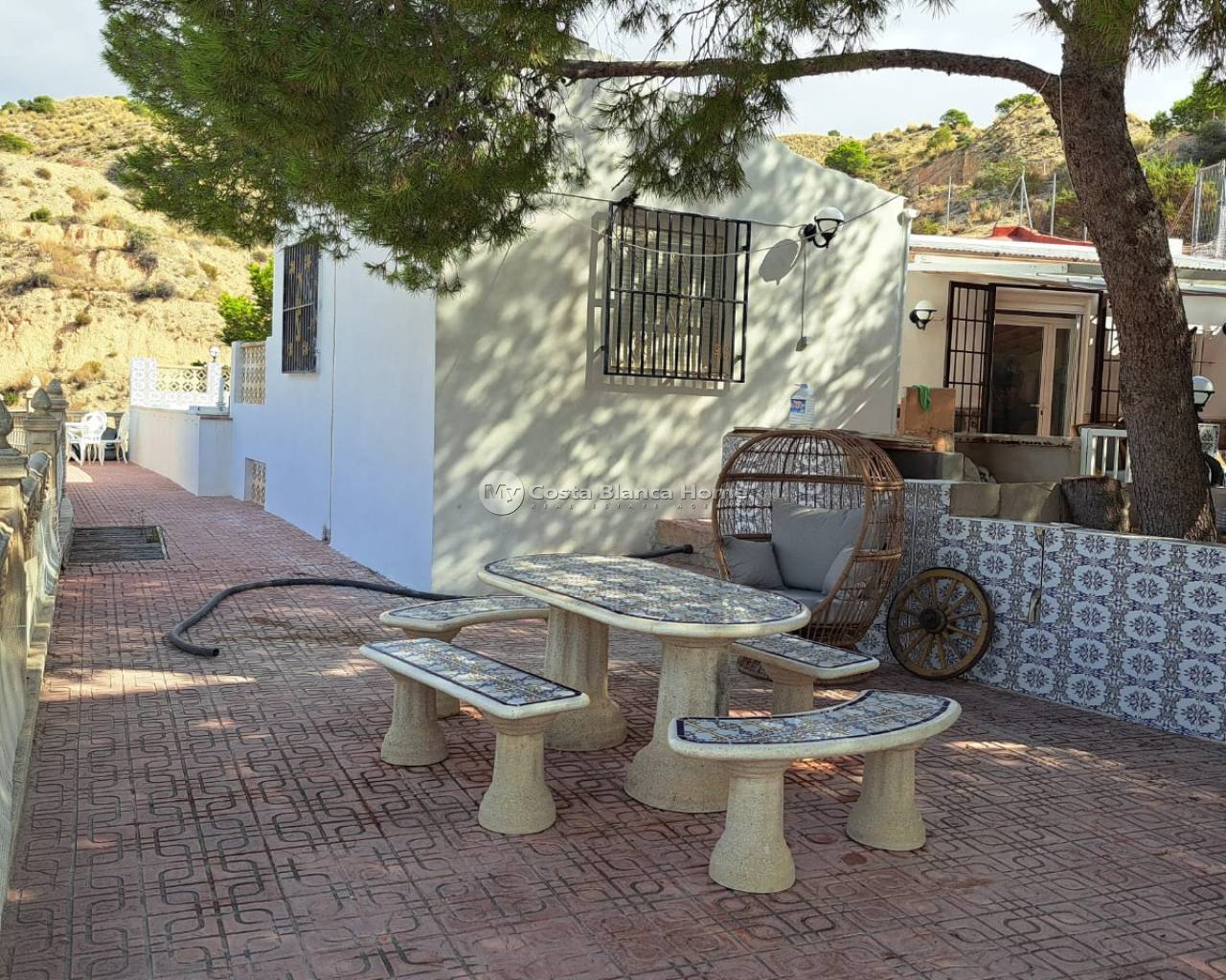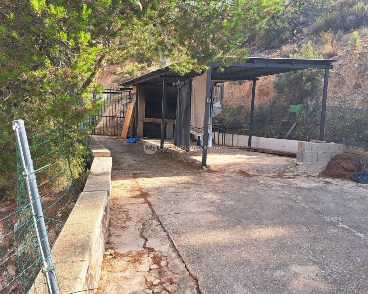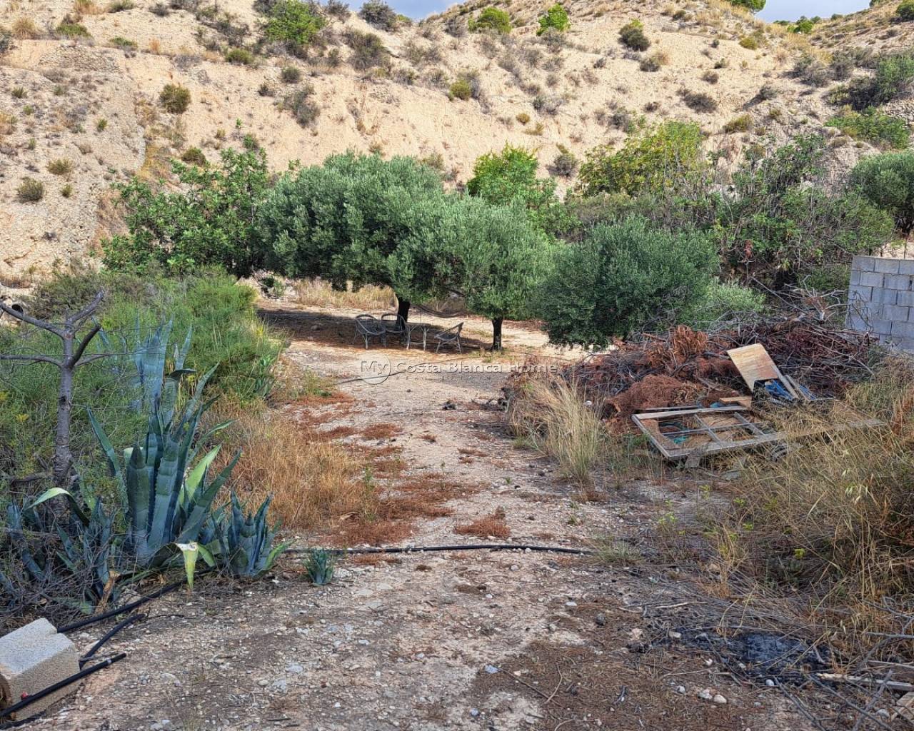 Rustic country house on the outskirts of Crevillente (Alicante), just 25 minutes from the beach, with stunning mountain views which can be admired from the property. The house has been largely renovated and consists of 4 bedrooms, one of which is a cave bedroom, 1 new bathroom, a large living room with a chimney, a dinning / lounge area with chimney, a completely new kitchen, a covered terrace and a renovated roof terrace area. It has a living area of 140m² and a plot of 9871m², although only the house and garden area is fully fenced. The house has multiple air conditioning units. The garden features a private pool, a large terrace, a summer kitchen with Pizza oven, that could be converted into a guest apartment, an external bathroom, a covered barbecue area and a huge storage room built into the mountain. There is also a carport in the entrance area. Most of the property is mountainous with some olive and pomegranate trees on individule layered plateau area. The house has electricity, mains water, irrigation water and a newly installed septic tank with a pump that pumps the water up the hill so the land can be irrigated.