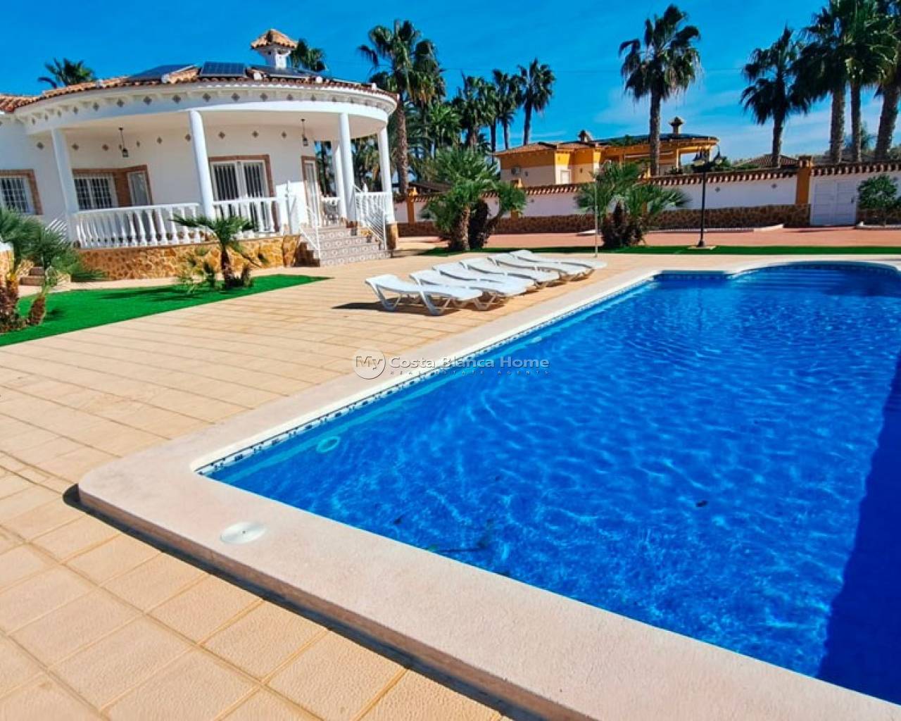 This Fantastic, Three Bedroom, Detached Country Villa in Catral is located amidst beautiful open countryside, offering peace, privacy, and stunning surroundings, yet just a 5 minute drive to the town for all amenities. The property benefits from an excellent road network along the coast, with the beaches and La Finca golf course both reachable within approximately 20 minutes, making this an ideal Costa Blanca South location. This impressive 163m² villa is all on one level and set within a beautifully landscaped and fully walled 2,329m² plot. The interior features a unique curved lounge area with air conditioning and a feature fireplace, along with two sets of opening glazed doors leading out to a covered terrace—perfect for indoor-outdoor living. The open plan fitted kitchen includes a breakfast bar and a door leading outside, while a wide archway leads into a versatile area that can be used as a dining or additional sitting space. There are three double bedrooms, all with built-in wardrobes, along with a family bathroom and two shower rooms, one of which is en suite. Externally, the property offers access to a private solarium where you can enjoy panoramic countryside views, along with the benefit of solar panels. The expansive plot is designed for easy maintenance, featuring paved areas, sections of artificial grass, and mature palm trees. A large 10 x 5 private swimming pool provides the perfect space to relax and entertain, while there is ample off-road parking and a garage for two cars with additional storage. The villa benefits from mains water and electricity, a water reserve system, and four solar panels, enhancing efficiency and sustainability. This exceptional country property combines space, comfort, and tranquillity, making it a perfect permanent residence or luxurious retreat in the heart of the Costa Blanca South.