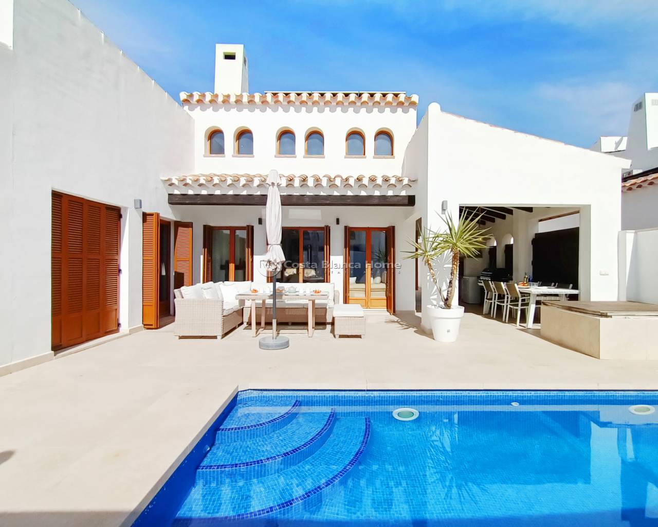 Renovated 4-Bedroom, 2-Bath Luxury Villa With South-Facing Pool â El Valle Golf Resort Step into contemporary Mediterranean elegance with this fully renovated and extended villa, designed for comfort, style, and outdoor living. Perfect for families or anyone seeking a luxurious lifestyle on El Valle Golf Resort. Key Features: 4 spacious bedrooms and 2 modern bathrooms - including a master suite with renovated en-suite bathroom, walk-in shower, and walk-in wardrobe Extended and fully refurbished kitchen with modern decor ideal for cooking enthusiasts Open-plan living and dining areas with patio doors opening onto a south-facing terrace and private pool â perfect for entertaining or relaxing in the sun South-facing private pool and terrace, equipped with pool heater and cover to enjoy year-round Solar panels for energy efficiency and reduced utility costs Updated air conditioning system and gas boiler for modern comfort throughout the year Property Details: Plot: 390m² Build Size: 160m² approx with extensions (original build 136m²) Community Fees: â¬625 Quarterly Furnished: Unfurnished Utilities: Gas, electric, and water connections plus solar panels Position: South-facing About El Valle Golf Resort: El Valle is a secure, gated community by Polaris World, featuring 24/7 security, landscaped gardens, and an 18-hole championship golf course. On-site amenities include: Clubhouse with bar & restaurant Spar supermarket, gym, tennis courts, playgrounds, and driving range Cycle paths and beauty salon Location Highlights: 10 minutes to Murcia International Airport 20 minutes to Los Alcázares beach Less than 15 minutes to local villages with shops, schools, and dining 1 hour to Alicante Airport Donât miss this exceptional opportunity to own a renovated, modern villa with a south-facing pool in one of the most desirable golf resorts in the region. For viewings or more information: Email: sales@sunsurehub.com WhatsApp: +34 692 215 470 Office: +34 868 321 959 Arrange a private tour today and start living the ultimate Mediterranean lifestyle on El Valle Golf Resort!