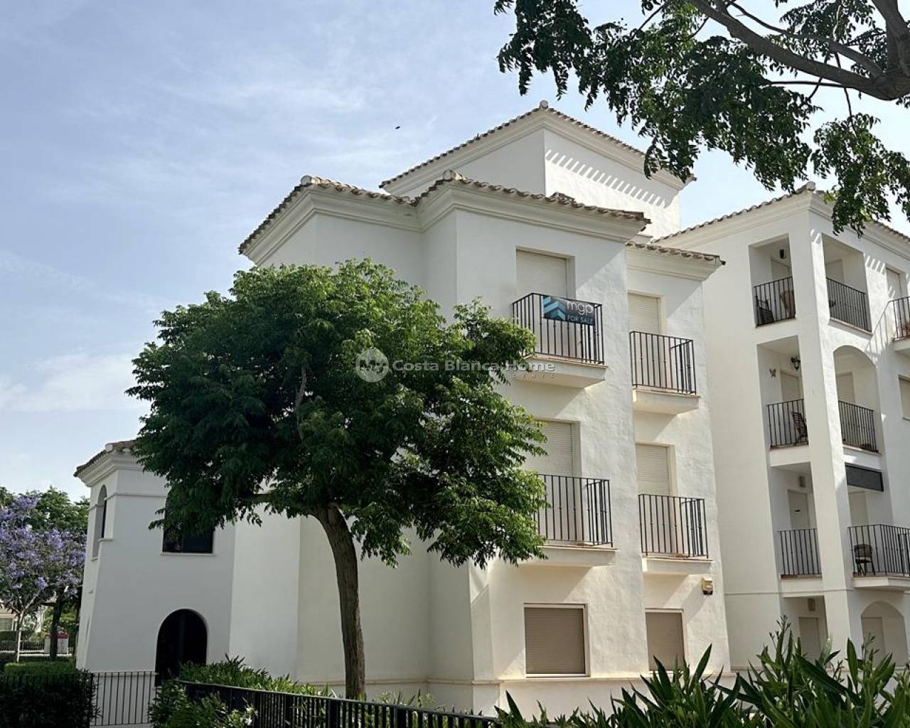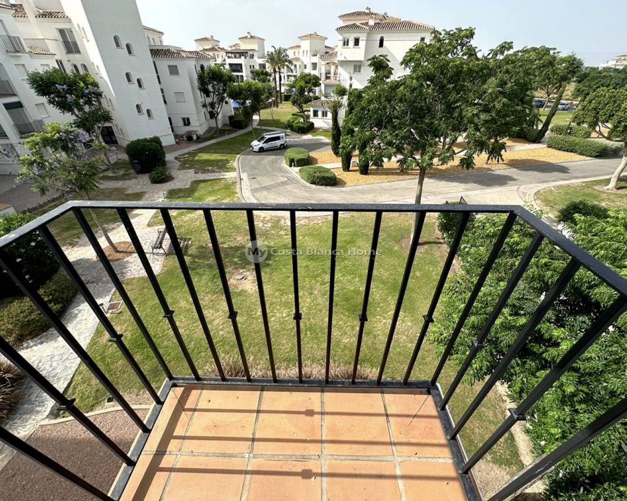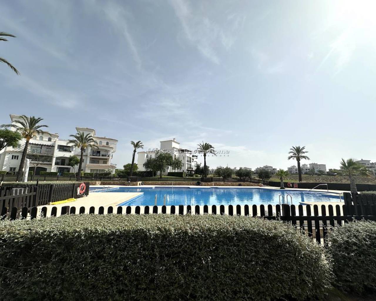 We take great pleasure to offer this rare two bedroom TWO BATHROOM end apartment on the stunning Hacienda Riquelme Golf Resort. The property is in a prime location, close to the El Cason clubhouse and supermarket. It is being sold furnished, with aircon in the lounge, gas central heating throughout, lift and stair access and allocated underground parking. The village of Sucina is a 5 minutes drive which offers an array of bars, restaurants and amenities. There is a bike path which would take 15 minutes to get to Sucina. This second floor apartment is like a top floor as it does not have another property above only the terrace of the penthouse. On entering the apartment there is an L shaped lounge diner with lots of light due to having three windows and large patio doors to the covered terrace which has views over the pool and golf. There is a galley kitchen with cupboards on both sides, this could easily be open planned to the lounge. The utility room has had a window installed to keep everything clean and ideal for storage. Opposite the kitchen is a family shower room which benefits from a window giving great ventilation. Both double bedroom have fitted wardrobe and doors leading to their own private juliet balconies. The master bedroom has an ensuite which also has a window. True two bathroom properties on Riquelme are very rare as they only built a few blocks with these types of apartments in them. Contact us to arrange to view this superb property.