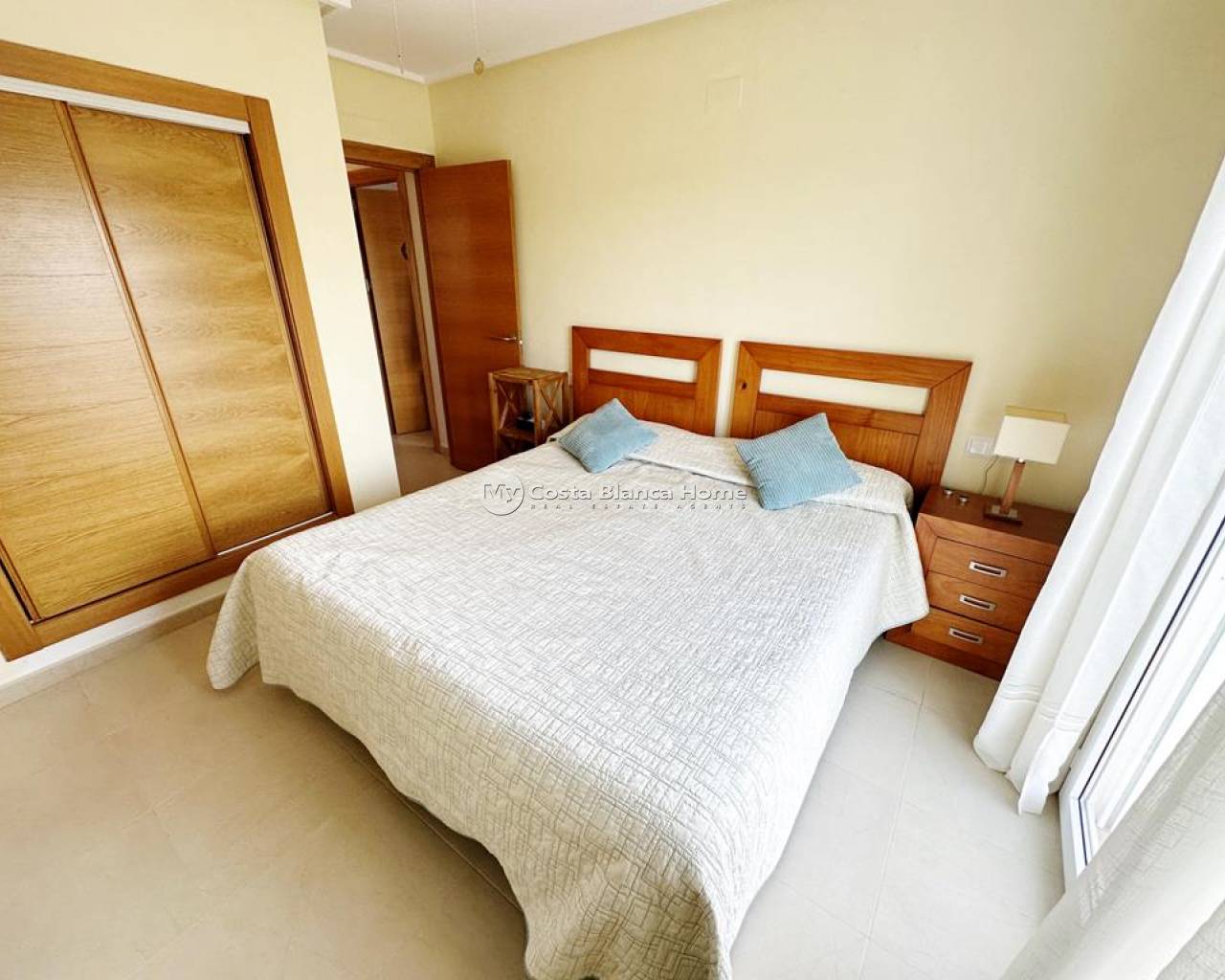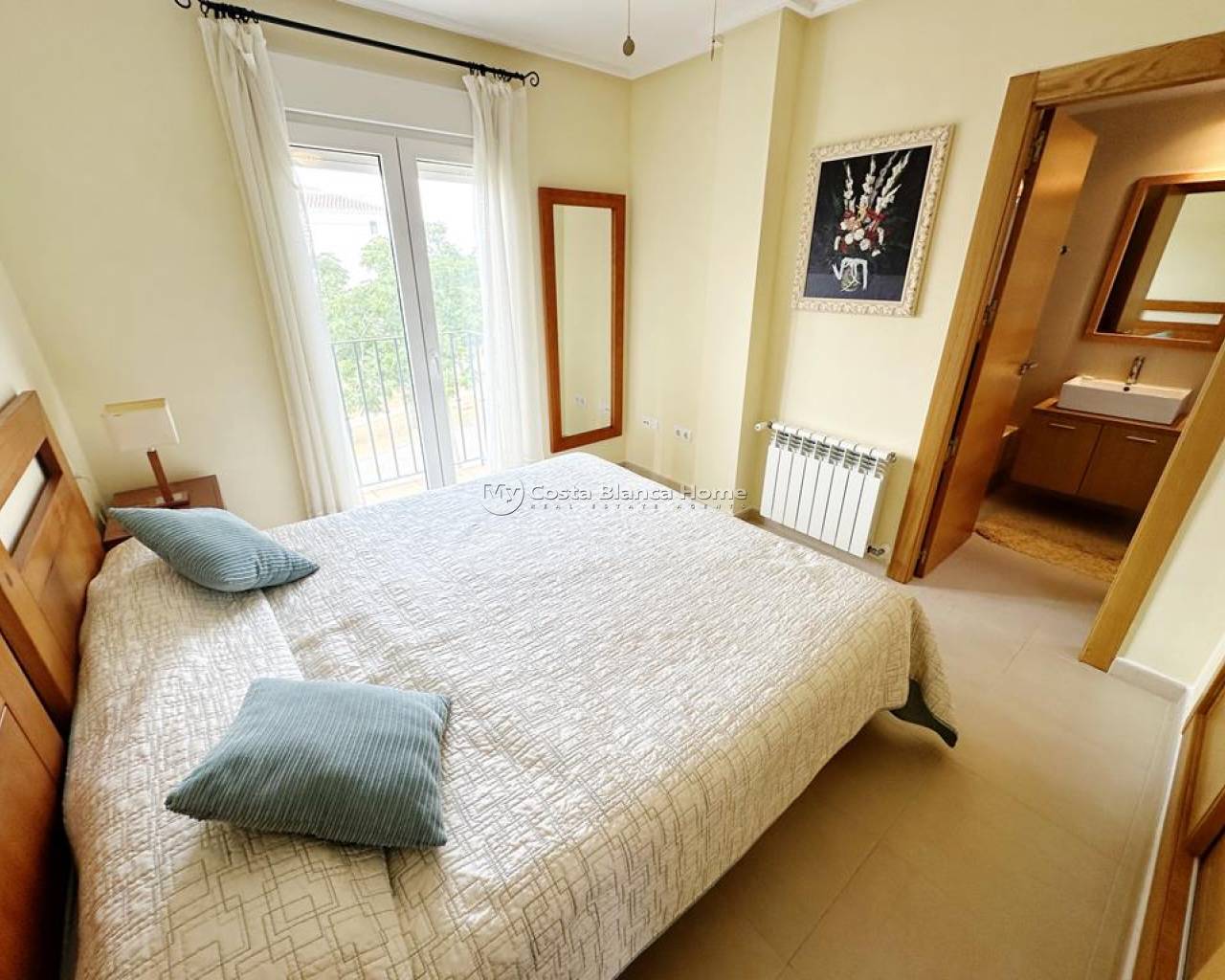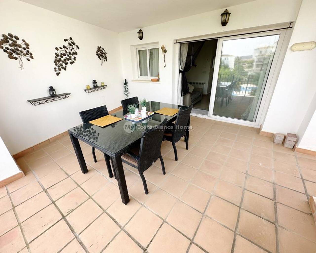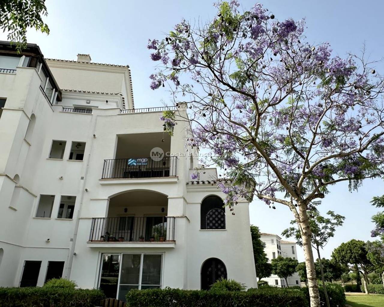 We take great pleasure to offer this rare two bedroom TWO BATHROOM end apartment on the stunning Hacienda Riquelme Golf Resort. The property is in a prime location, close to the El Cason clubhouse and supermarket. It is being sold furnished, with aircon in the lounge, gas central heating throughout, lift and stair access and allocated underground parking. The village of Sucina is a 5 minutes drive which offers an array of bars, restaurants and amenities. There is a bike path which would take 15 minutes to get to Sucina. This second floor apartment is like a top floor as it does not have another property above only the terrace of the penthouse. On entering the apartment there is an L shaped lounge diner with lots of light due to having three windows and large patio doors to the covered terrace which has views over the pool and golf. There is a galley kitchen with cupboards on both sides, this could easily be open planned to the lounge. The utility room has had a window installed to keep everything clean and ideal for storage. Opposite the kitchen is a family shower room which benefits from a window giving great ventilation. Both double bedroom have fitted wardrobe and doors leading to their own private juliet balconies. The master bedroom has an ensuite which also has a window. True two bathroom properties on Riquelme are very rare as they only built a few blocks with these types of apartments in them. Contact us to arrange to view this superb property.